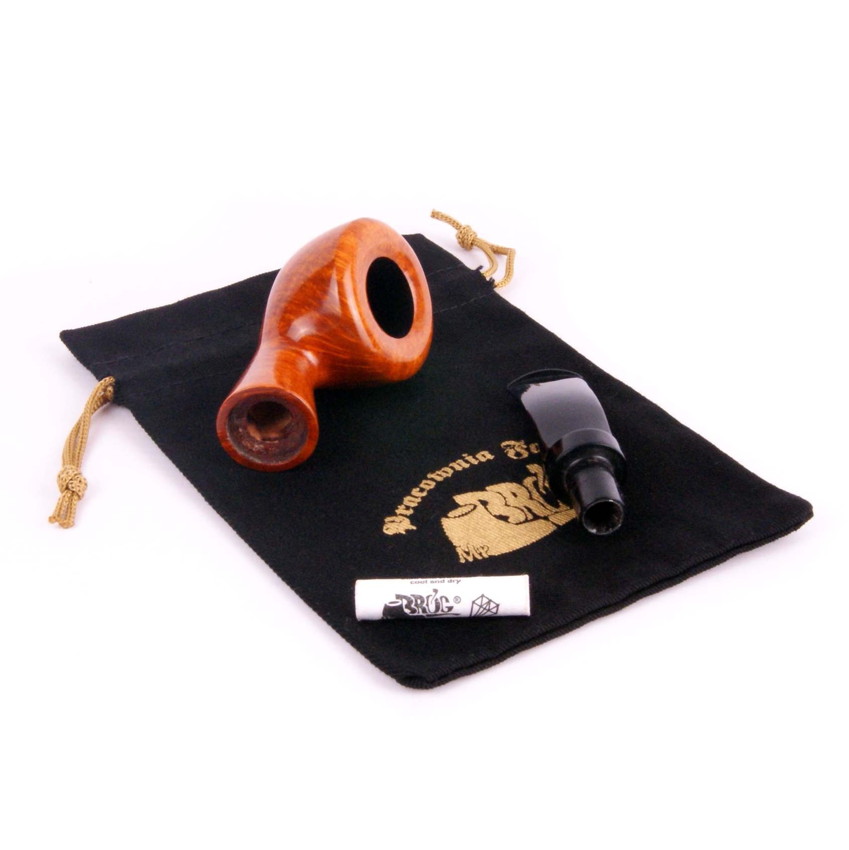 Цікава труба, виготовлена вручну з італійського шипшини, відрізняється компактними розмірами і попередньо навугленою топкою (натуральні труби мають топку без прекарбонату) трохи меншої місткості. Злегка вигнутий мундштук має змінний фільтр діаметром 9 мм і широкий накус, що полегшує утримання трубки в роті під час виконання будь-яких видів діяльності. Легка, зручна для прогулянок і зручна у використанні люлька упакована в тканинний чохол і коробку. Шипшина - Італія/Лігурія, шипшина - Mimmo, клас - Екстра.