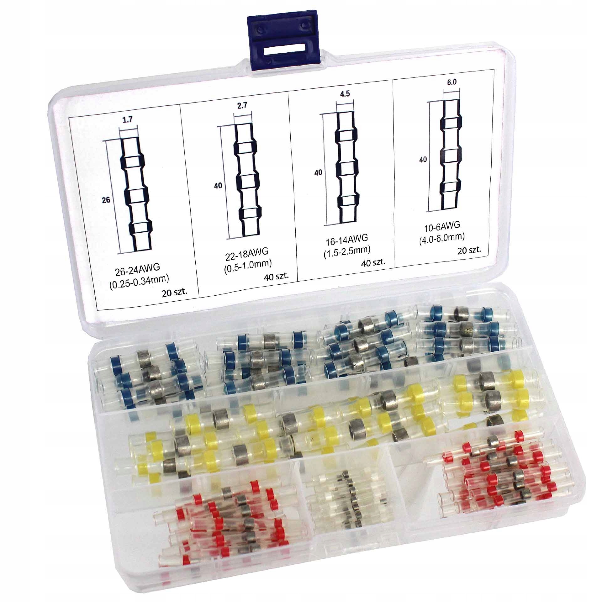 - Швидкі з’єднувачі з жовто-прозорою жерстою, діапазон кабелю: 4~6 мм2 (20 шт.), довжина 40 мм