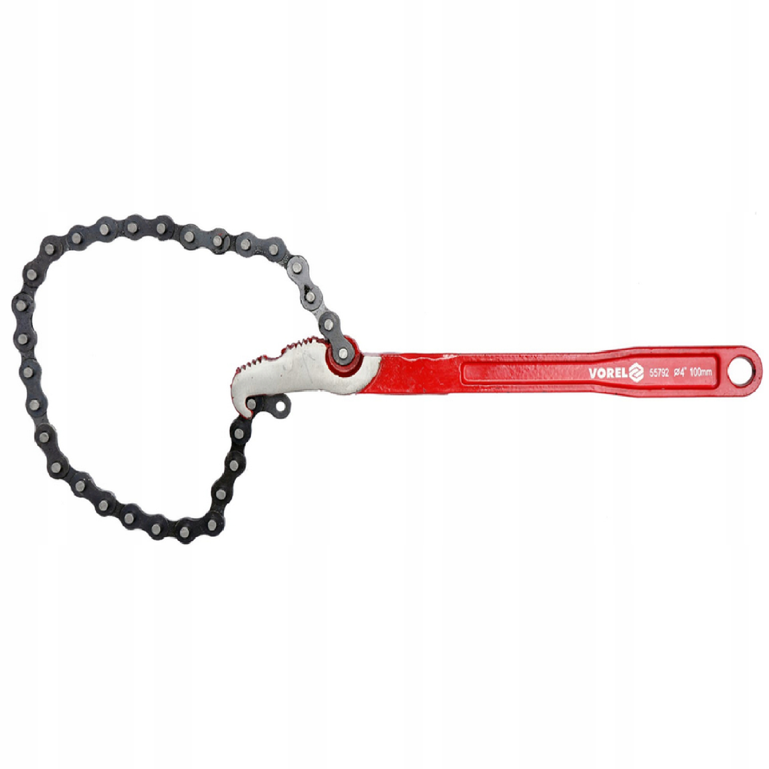 Ланцюг довжиною 400 мм, регульований регулювання діаметра для відкручування і загвинчування труб з максимальним діаметром 100 мм (4"). Корпус довжиною 300 мм з кованої сталі, загартовані зубці індуктивно.