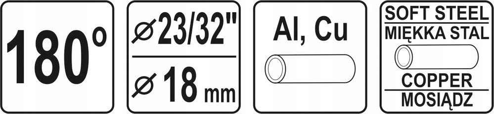 Згин для труб діаметром 18 мм. Дозволяє згинати труби під кутом 180° без їх здавлювання. На корпусі вибиті кути для визначення ступеня вигину. Замок покращує фіксацію труб і дозволяє згинати навіть короткі ділянки. Дозволяє згинати труби з: м'якої міді, алюмінію, м'якої сталі.