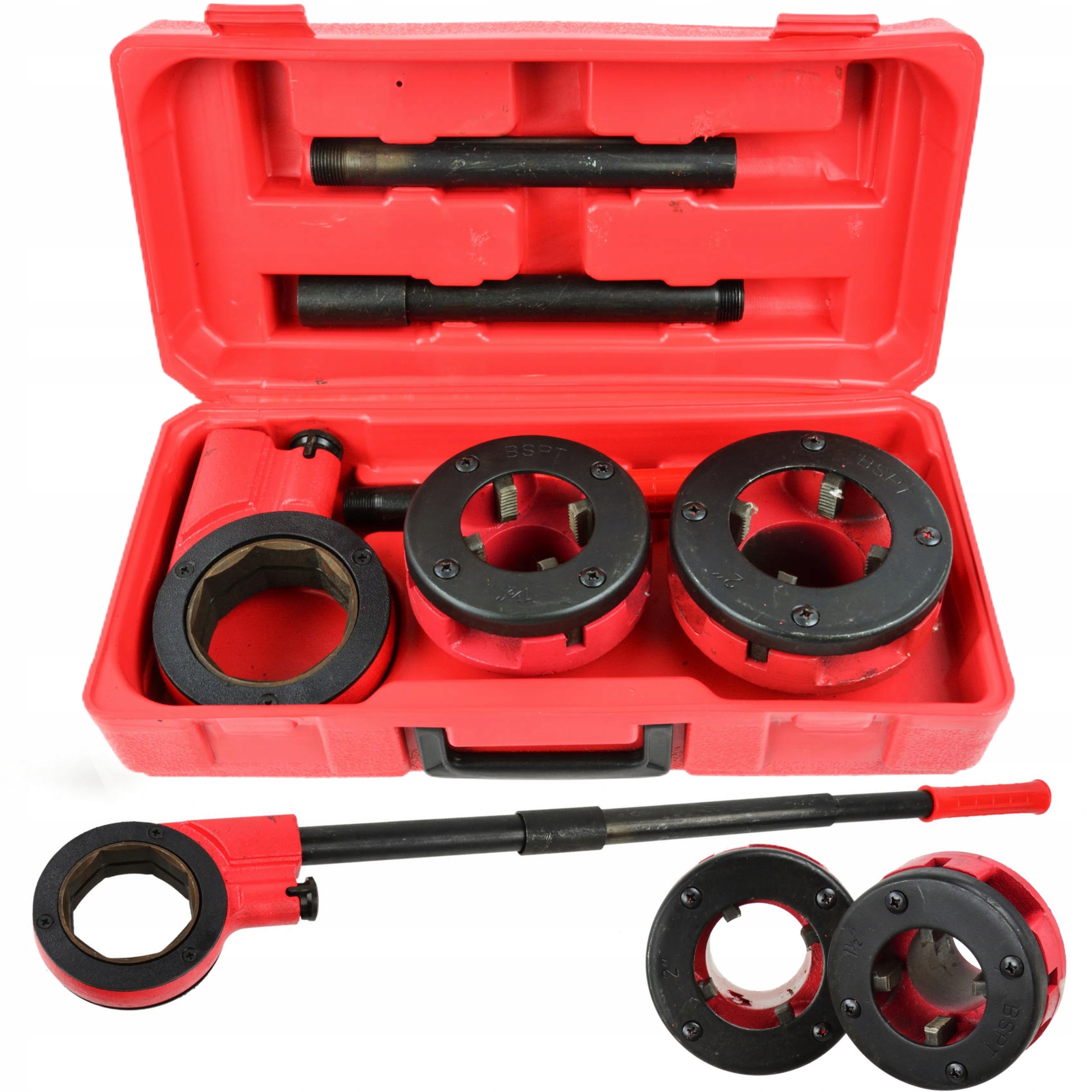 Гідравлічний нарізувач труб в комплекті з 2 плашками. Пристрій використовується для нарізання різьблення труб і фітингів. Його можна використовувати як під час ремонту, так і під час будівництва. Зуби нарізні з легованої сталі CrV з твердістю HRC в діапазоні 58-62. Корпус матриці з чавуну.
