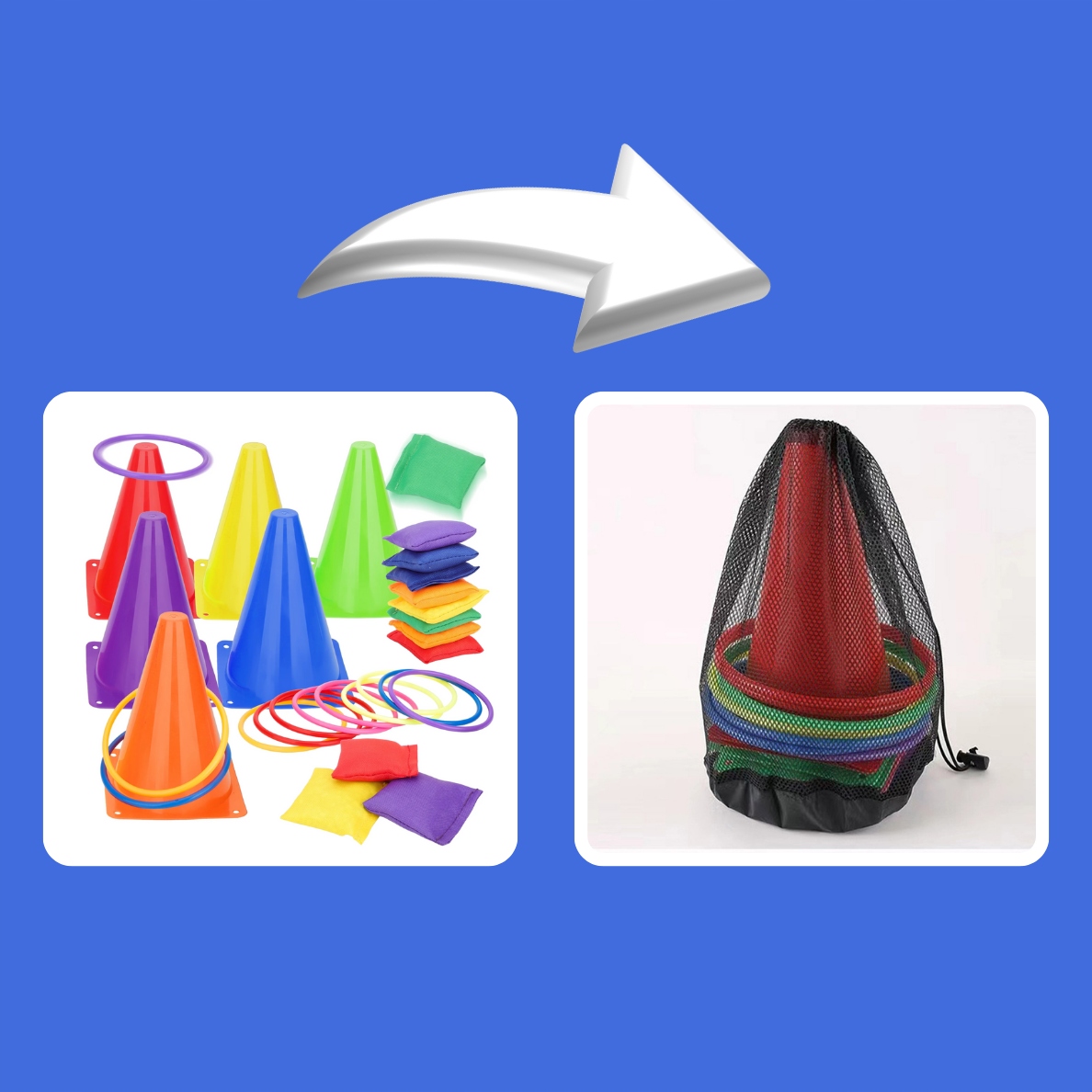 Весь набір знаходиться в зручному мішку, який полегшує зберігання та транспорт. Якраз вчасно для пікніка, свят або уроків ПЕ!