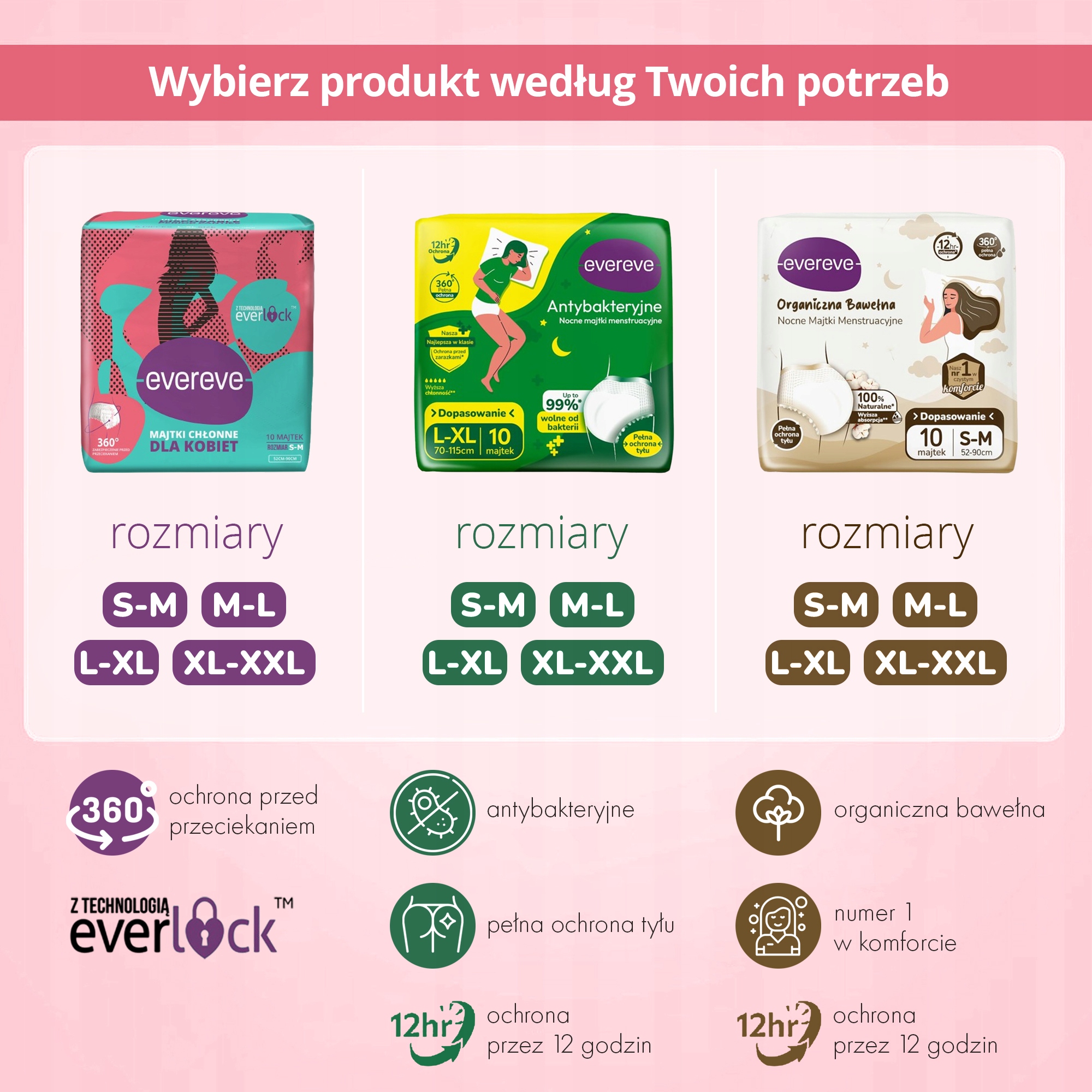 Evereve - служать альтернативою традиційним продуктам для менструації, таким як тампони або гігієнічні прокладки. Їх можна використовувати окремо або в поєднанні з іншими продуктами залежно від інтенсивності кровотечі та потреб і переваг людини, яка їх використовує. Нижня білизна Evereve, створена спеціально для жінок, які борються з нетриманням сечі, забезпечує надійний захист, забезпечуючи комфорт і розсудливість.