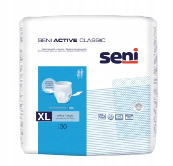 Seni Active Classic - дихаючі, поглинаючі, одноразові трусики підвищений рівень поглинання. Ідеально підходить для активних людей життя та для людей, які беруть участь у заняттях з фізичної реабілітації середня та важка проблема нетримання сечі. Одягайте як звичайну білизну. Їх також можна використовувати при нетриманні калу.