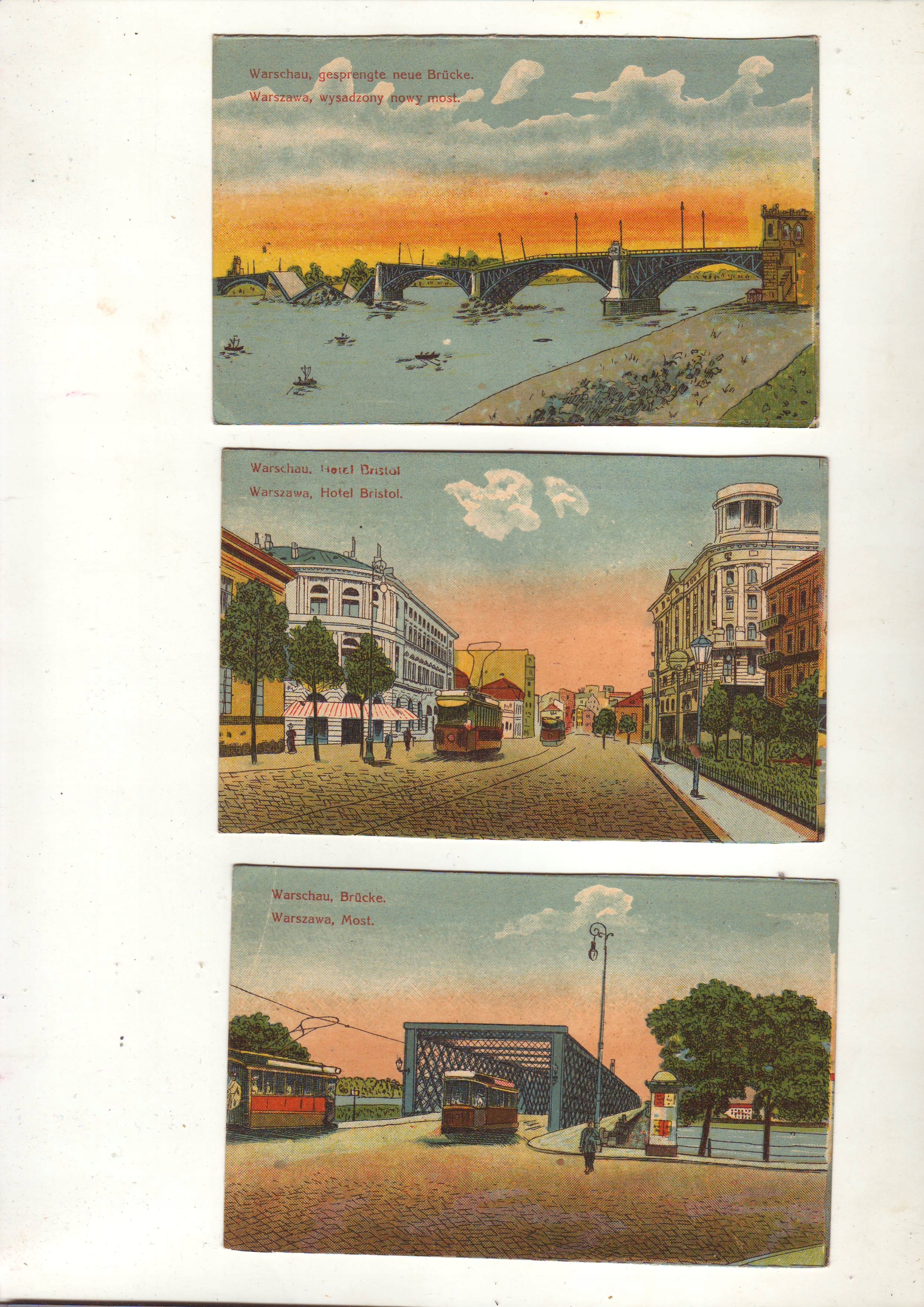 Trzy unikatowe pocztówki kolorowane z Warszawy