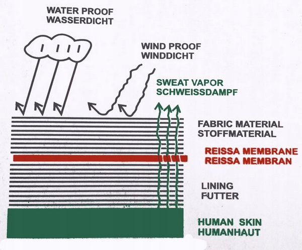 - обладнана мембраною Reiss з високим вмістом водяної пари проникність , вітро- та водонепроникний, дихаючий