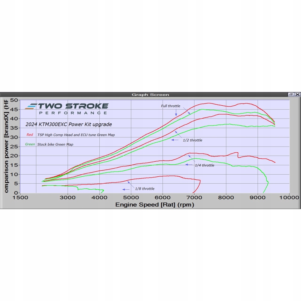 Новий двигун 2024 EXC дуже плавний у стандартній формі, але також дуже м’який у передачі потужності в усіх положеннях дросельної заслінки. На динамометричному стенді це один із найм’якших 300-х, які ми бачили за кілька років, лише 45 обертів на піку потужності, порівняно з попередніми моделями TPI приблизно 49 і новими 300XC TBI 57. Так само на низькому газі та низьких/середніх оборотах він все ще дуже плавний, але не має крутного моменту, що фактично ускладнює їзду в деяких ситуаціях. Під час тестування стандартного 300EXC 2024 року поруч з 300TPI 2022 року з нашою головою та ECU в Румунії в липні 2023 року ми виявили, що на налаштованому TPI було набагато легше їздити в складних умовах жорсткого ендуро, оскільки він дозволяв вам їздити на вищій передачі в більшості ситуацій, використовуючи нижчі оберти та менше обертання коліс, і, як наслідок, він міг важко підняти передню частину та трактор. секції набагато легші з меншою кількістю газу та меншими зусиллями.