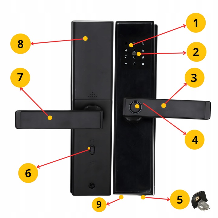 - Замок є універсальним і безпечним рішенням для вашого дому чи офісу. За допомогою п’яти різних методів розблокування, включаючи відбиток пальця, пароль і , цей дверний замок гарантує, що лише авторизовані люди зможуть отримати доступ. І більше не турбуйтеся про втрату ключів.