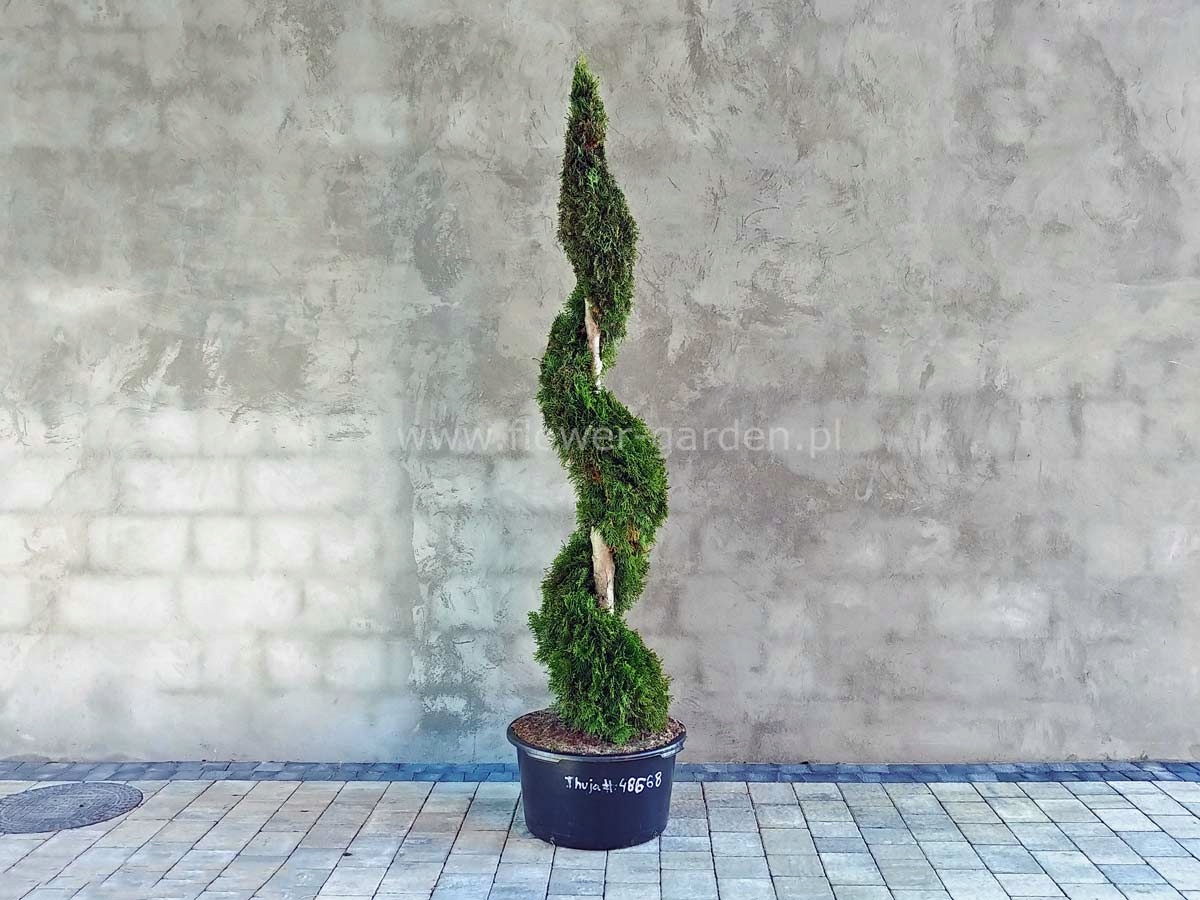 Пропозиція стосується кількарічної регулярно стриженої туї спіралевидної форми в горщику. Вказана висота — це висота самої рослини без горщика.