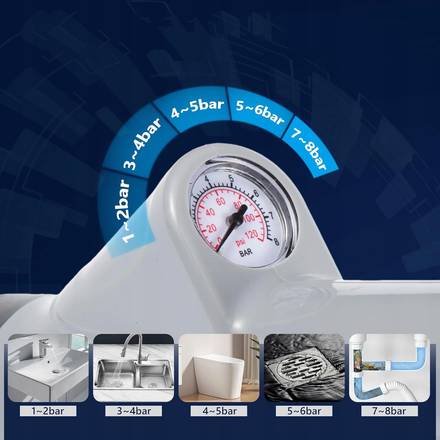 🚽🚽🚽【 Видимий тиск повітря】 Використовуйте манометр, щоб перевірити тиск у режимі реального часу. Регулюючи тиск відповідно до різних потреб, ми рекомендуємо неголовні раковини, овочеві басейни, туалети та підлоги з тиском 5-6 бар, до 8 бар. Підходить для всіх труб, не містить шкідливих хімічних речовин, є екологічно чистим і може використовуватися у всіх стоках для запобігання родовищам та збереження стоків у чистоті.