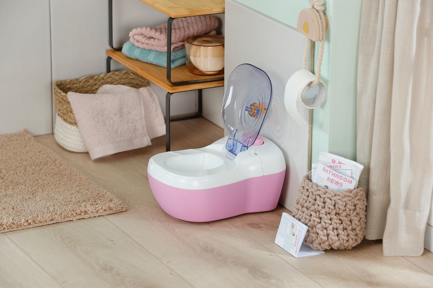 - Туалетна щітка та пляшка з миючим засобом допомагають підтримувати туалет у чистоті та можуть зберігатися в практичних відділеннях