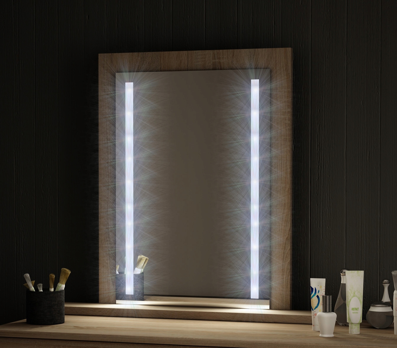 Дзеркало має світлодіодну стрічку з діодами нейтрального світлового кольору, рекомендовану для нанесення макіяжу. Смужки кріпляться з тильного боку дошки тому дзеркальна поверхня спереду абсолютно гладка, а встановлення світлодіодів абсолютно непомітно.