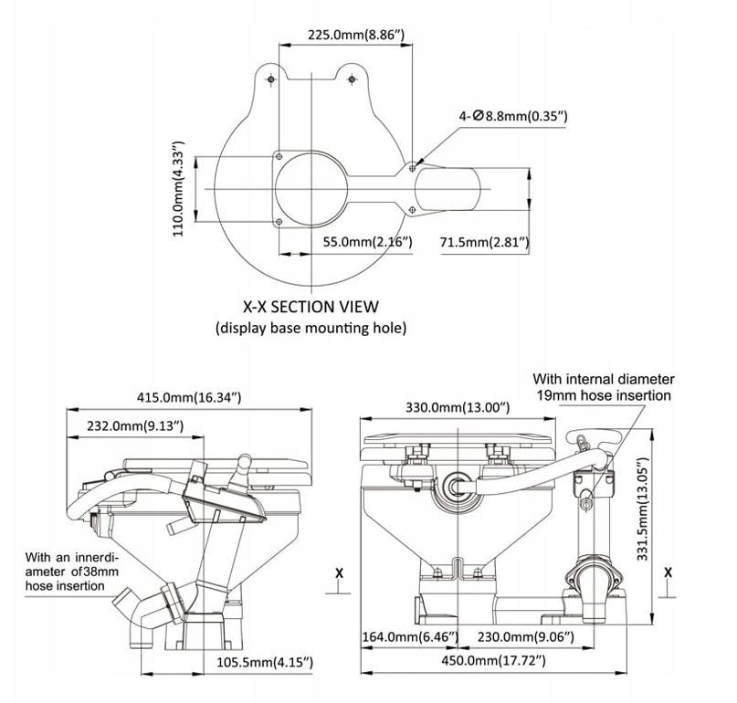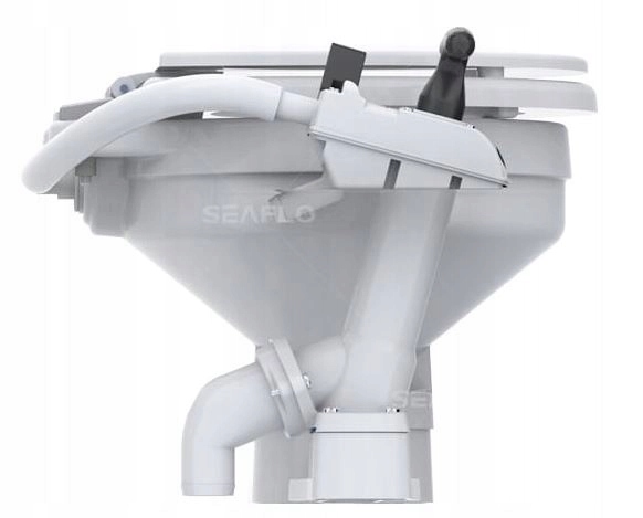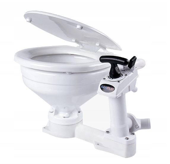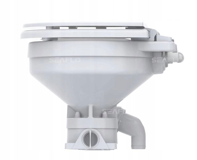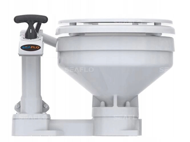 SEAFLO MANUAL MANUAL YACHT TOILET - Туалет для яхти або туристичних транспортних засобів, таких як каравани або кемпери. Виготовлений з кераміки та пластику. Має поршневий насос, який всмоктує і змиває воду після перемикання важеля. Його можна встановити як на моторні, так і на вітрильні човни, вище або нижче ватерлінії, для використання на морі, річці, озері чи каналі. Установка може скидати відходи за борт (якщо це дозволено національними та місцевими правилами), або в систему очищення, або в бортовий резервуар для зберігання. Порцелянову миску легко чистити. Блокуюча ручка захищає від затоплення та зворотного потоку відходів, закриваючи випускний клапан. Зливний бачок можна встановити як з лівого, так і з правого боку.