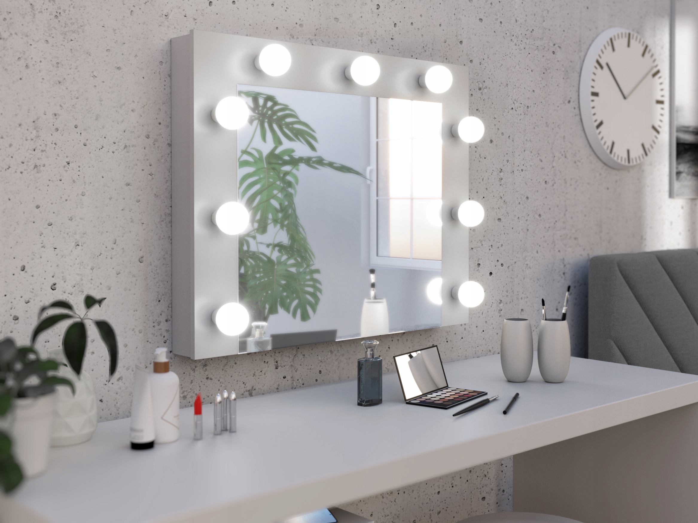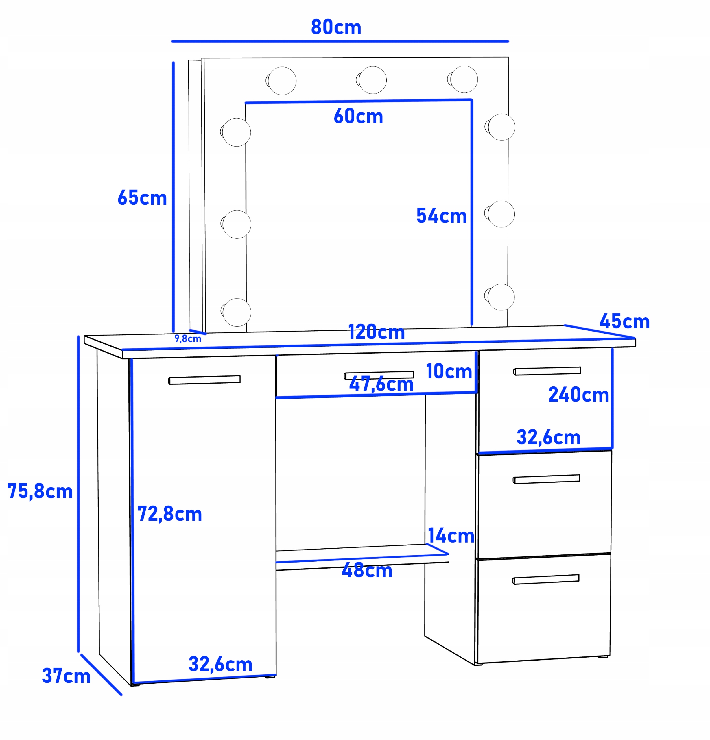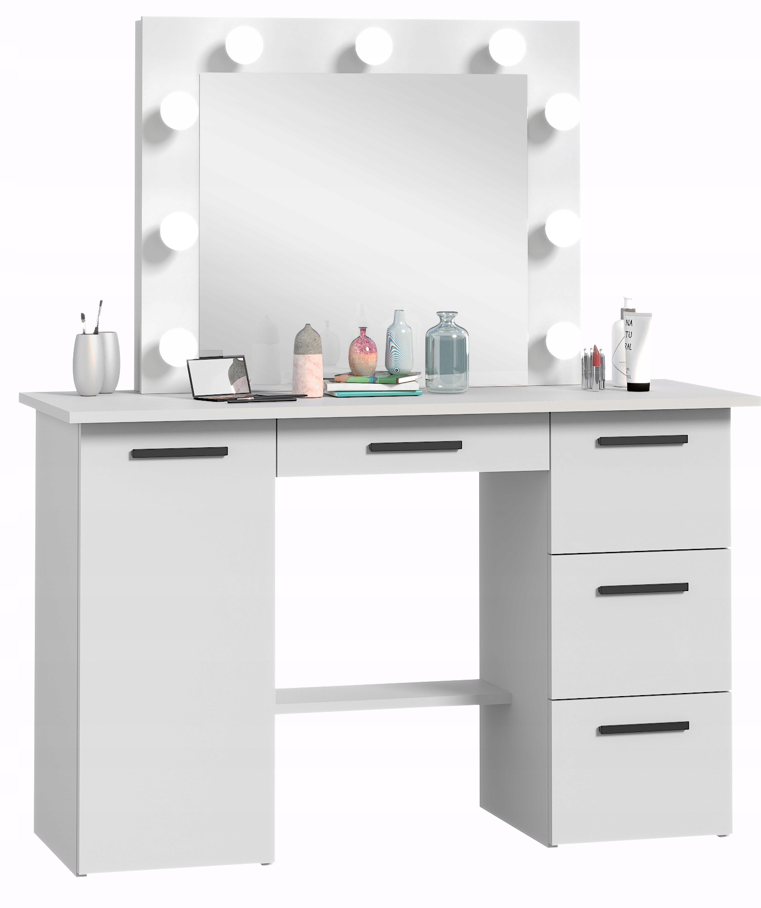 Сулактер з дзеркалом, освітленим 9 цибулинами, є ідеальним місцем для щоденного догляду та підготовки. Оснащений 4 ящиками, закритою шафою та додатковою полицею між постами, пропонує важке місце для зберігання косметики та аксесуарів. Завдяки гармонійному поєднанню функціональності з витонченістю, цей туалетний столик стане основним центром вашого макіяжу та догляду.