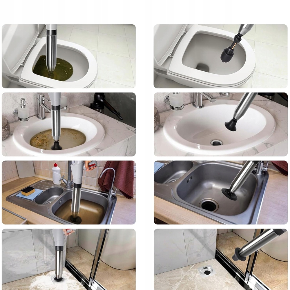 очищувачі труб використовує потужність стисненого повітря під високим тиском, так що через кілька секунд його легко видаляти з трубопроводу. Вдосконалена конструкція трубчастої кулі має 360-градусний вигин без мертвих куточків, що ідеально підходить для використання для засміченого туалету. Поршень легко вставити та видалити і ідеально підходить для використання в якості насоса для очищення відтоків або туалетного розпилення.
