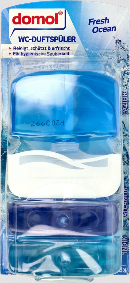 Підвіска Domol для унітазу Свіжість океану забезпечує довготривалу свіжість кожного змиву. Очищуючий концентрат бореться з накипом і вапняком і запобігає утворенню бруду. Забезпечує гігієнічну чистоту по всьому туалету.