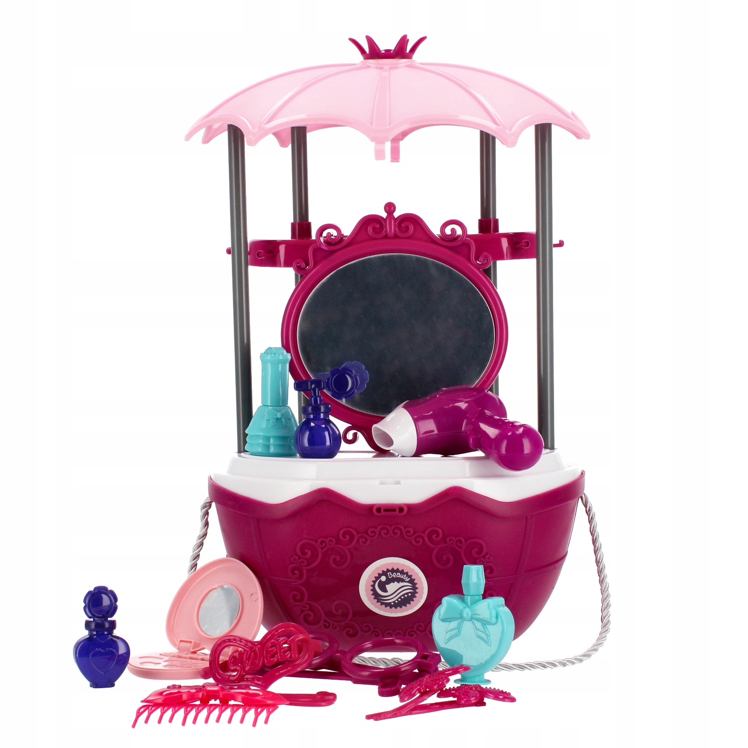 У набір входить: туалетний столик з козирком, дзеркало, окуляри, 3 х затискачі, тіні для повік, 2 х флакони для духів, гребінець, фен, затискач з гребінцем.