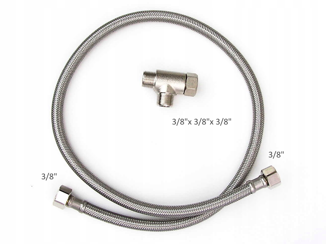 У набір входить: трійник 3/8"x3/8"x3/8", гнучкий шланг з нержавіючої сталі в оплітці з внутрішньою різьбою 80см 3/8"Ш x 3/8"Ш