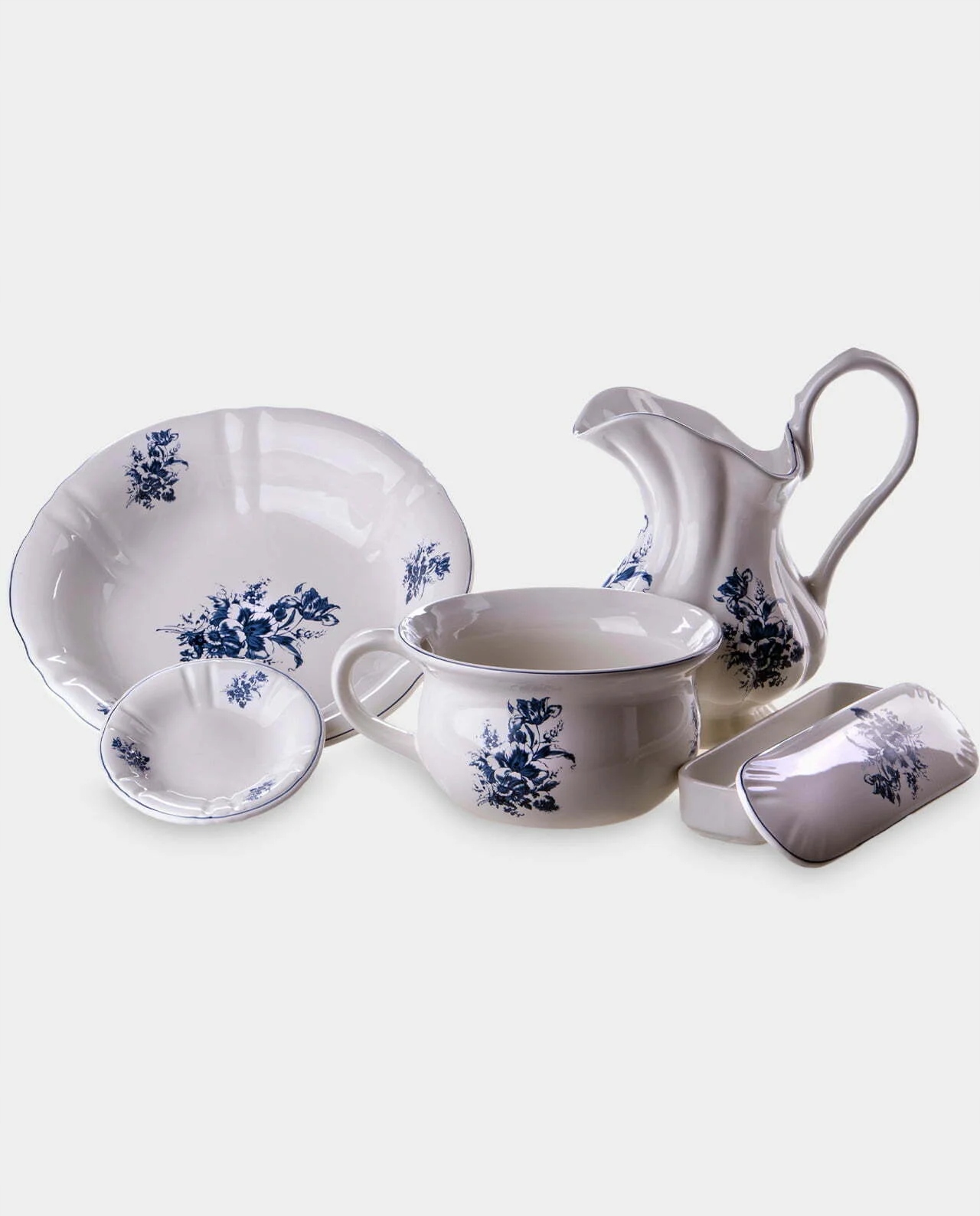 Порцеляновий туалетний набір в садибному стилі, складається з 6 елементів. Гарний, білий, з декором із зображенням синіх квітів. Виготовлений з ексклюзивного матеріалу дуже акуратно, з увагою до найдрібніших деталей. Він справляє чудове естетичне враження та має позачасовий стиль. Підходить для багатьох інтер’єрів.