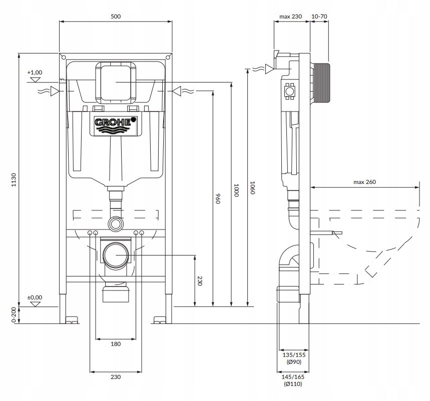 - Прихована сталева рама RAPID SL 2-в-1 для легка установка; висота: 113 см, ширина: 50 см, монтажна глибина: 13 - 23 см