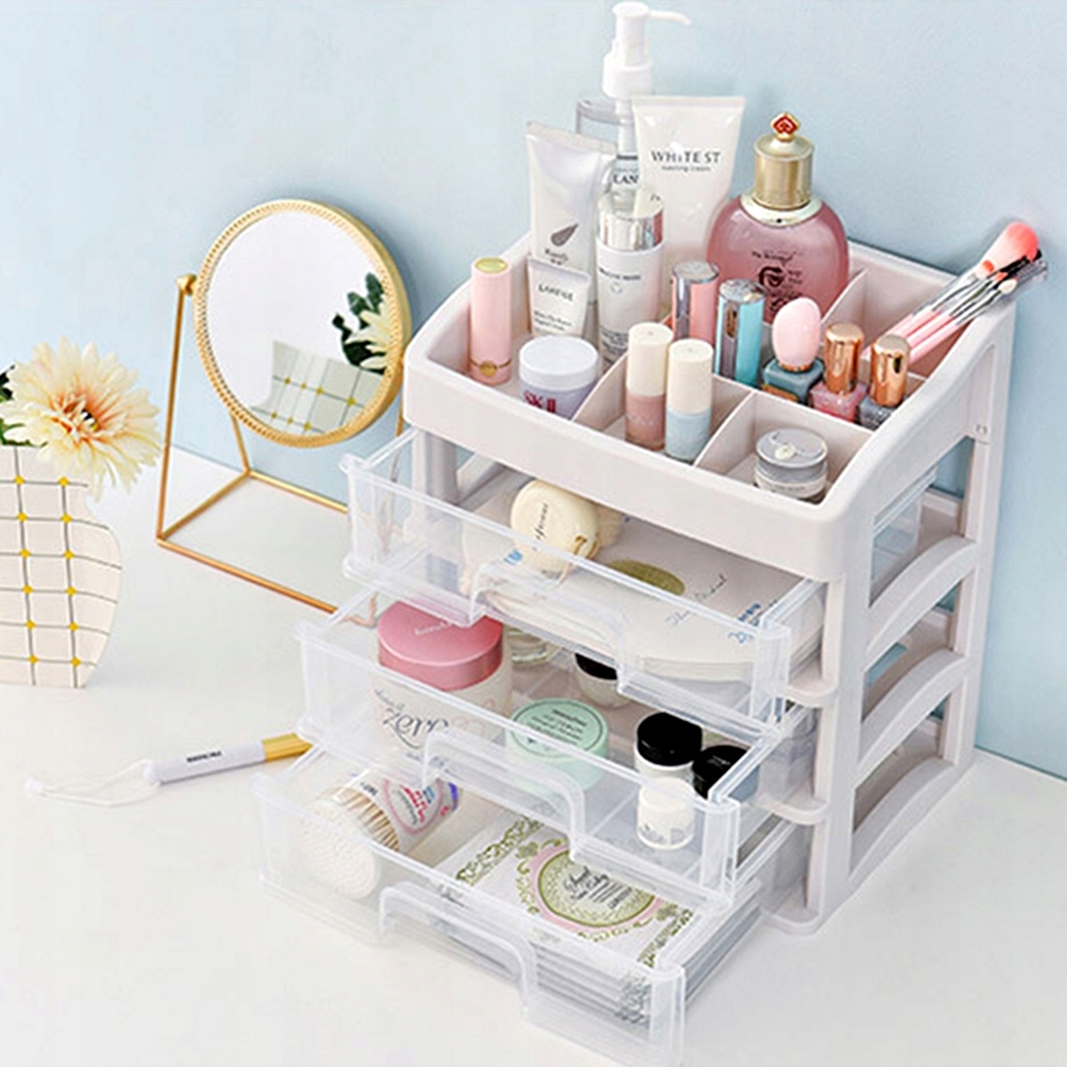 - Практичний органайзер для косметики з трьома ящиками.