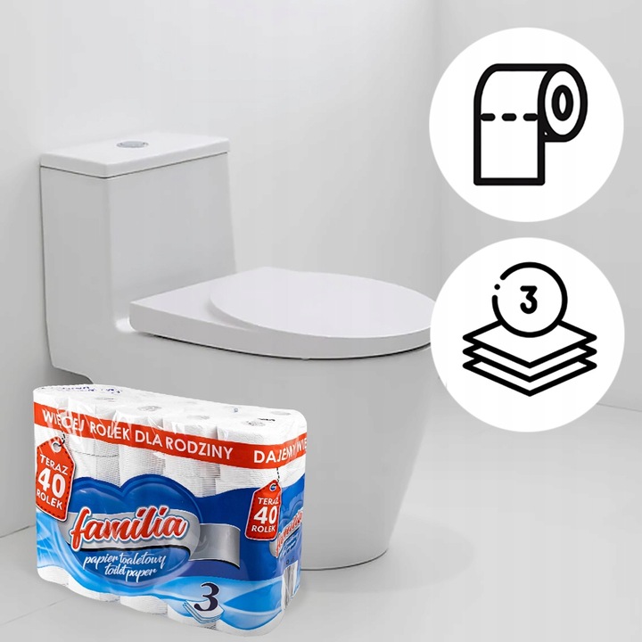 Папір Familia — це м'який і міцний туалетний папір, виготовлений із целюлози в поєднанні з вибіленою макулатурою. В упаковці 40 рулонів, прикрашених елегантним тисненням. Надзвичайно ніжний до шкіри.