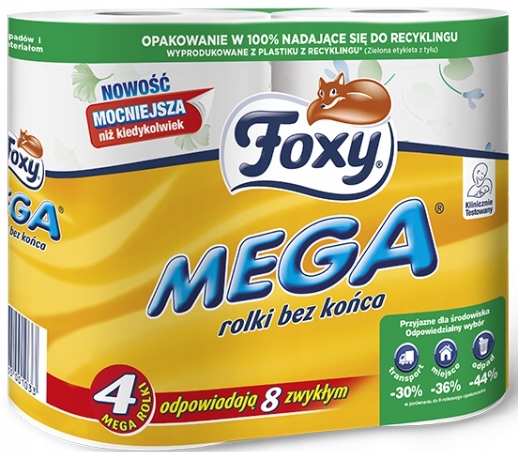 Foxy Mega - дуже зручне рішення. Одна компактна упаковка замість 8 рулонів звичайного паперу. У цьому продукті досягнуто балансу між м’якістю та довговічністю.