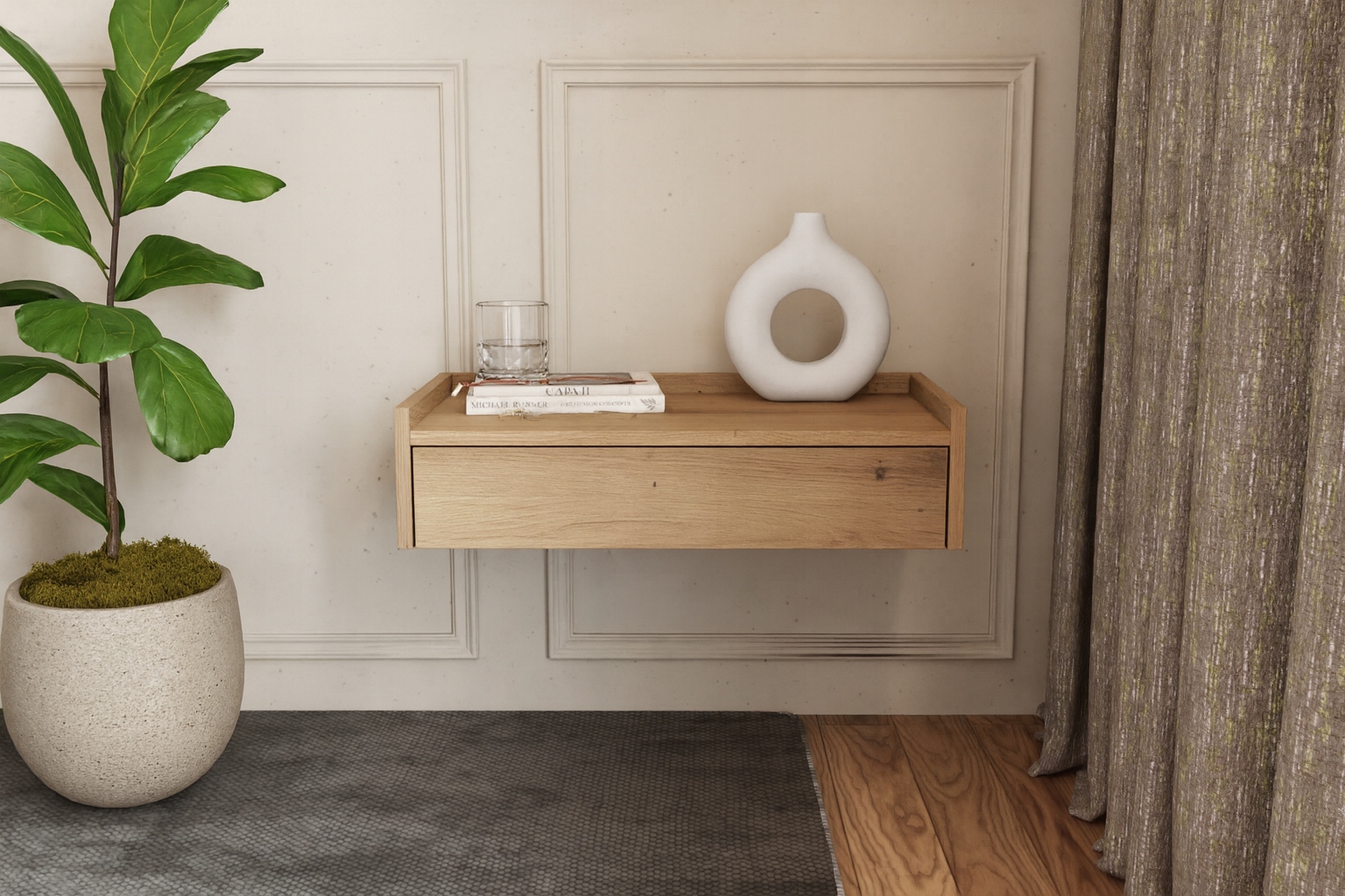 Дубовий декор Artisan відрізняється теплим сільським відтінком з видимим зерном - він ідеально поєднується з інтер'єрами в скандинавському, горищному, сучасному та бохо -стилі. У наборі з підвісним ліжковим столом Nuvia створює надзвичайно добре годуючий набір для кожної спальні.