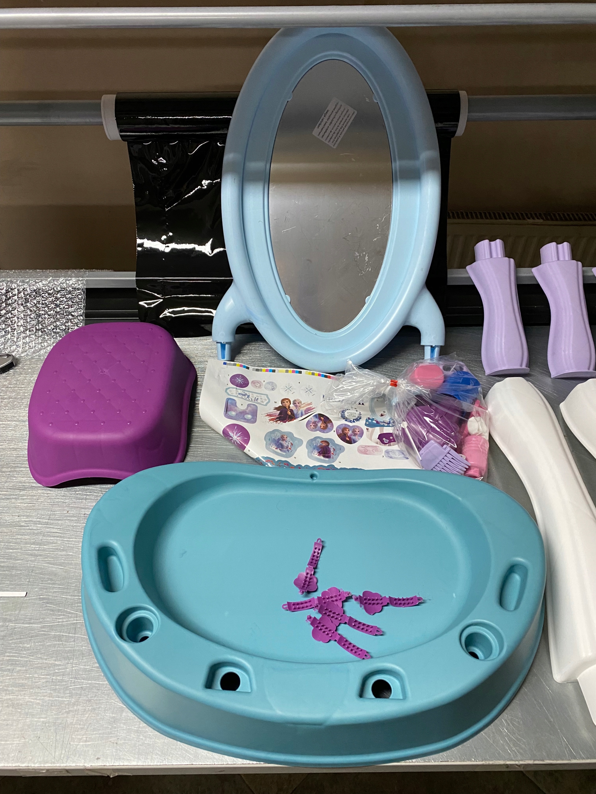 Приходьте в перукарню Disney FROZEN! Ви або ваші друзі, брати і сестри можете посидіти на зручному сидінні та побалувати себе. Стійкий туалетний столик із великим дзеркалом повністю виконано в улюблених кольорах Disney FROZEN.