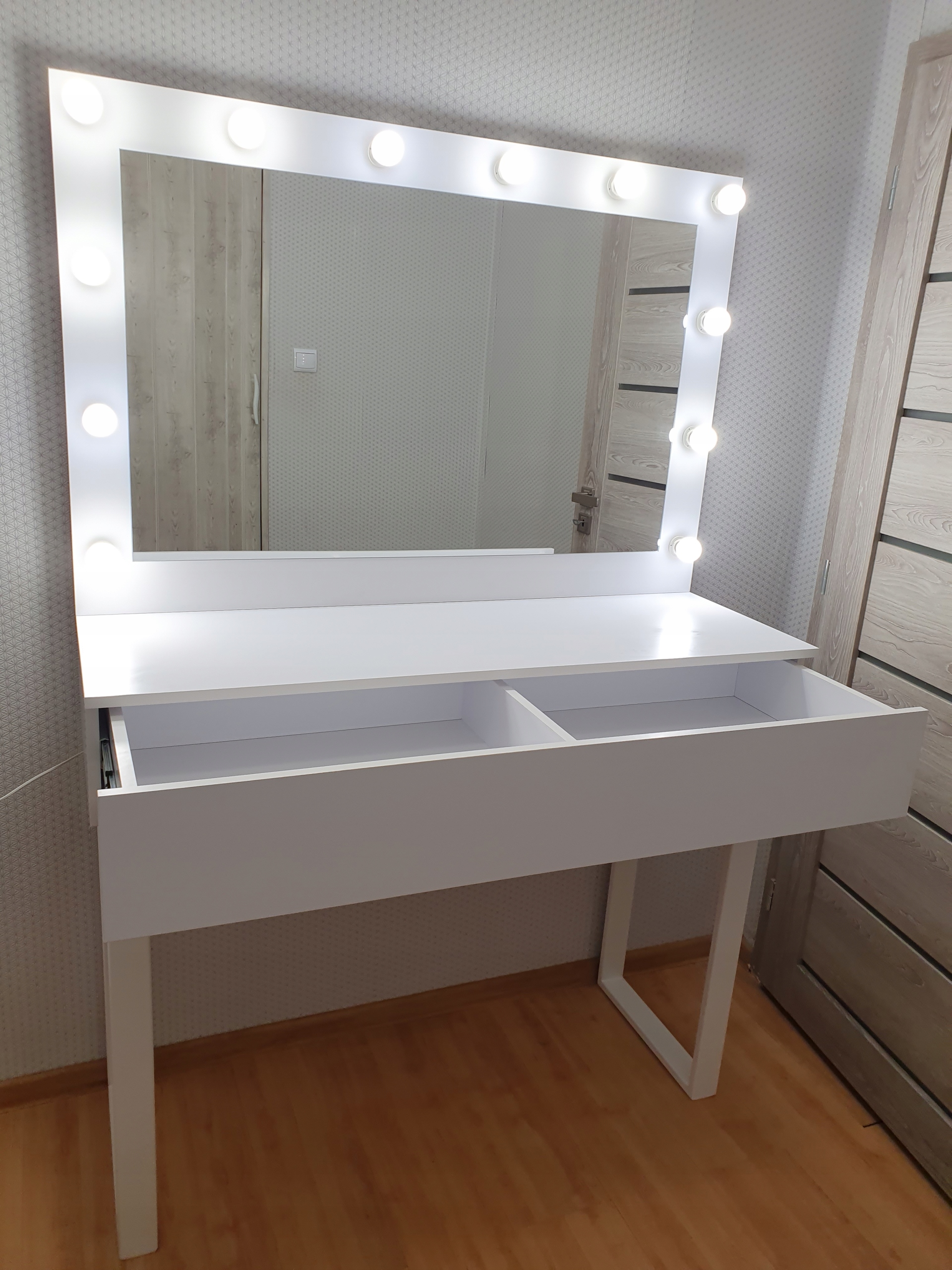Найголовніше для нас – це освітлення, ми встановили 12 патронів для лампочок. в нашому дзеркалі, які покликані забезпечити рівномірне і достатнє яскраве освітлення обличчя. Це також стане запорукою ідеального макіяжу.