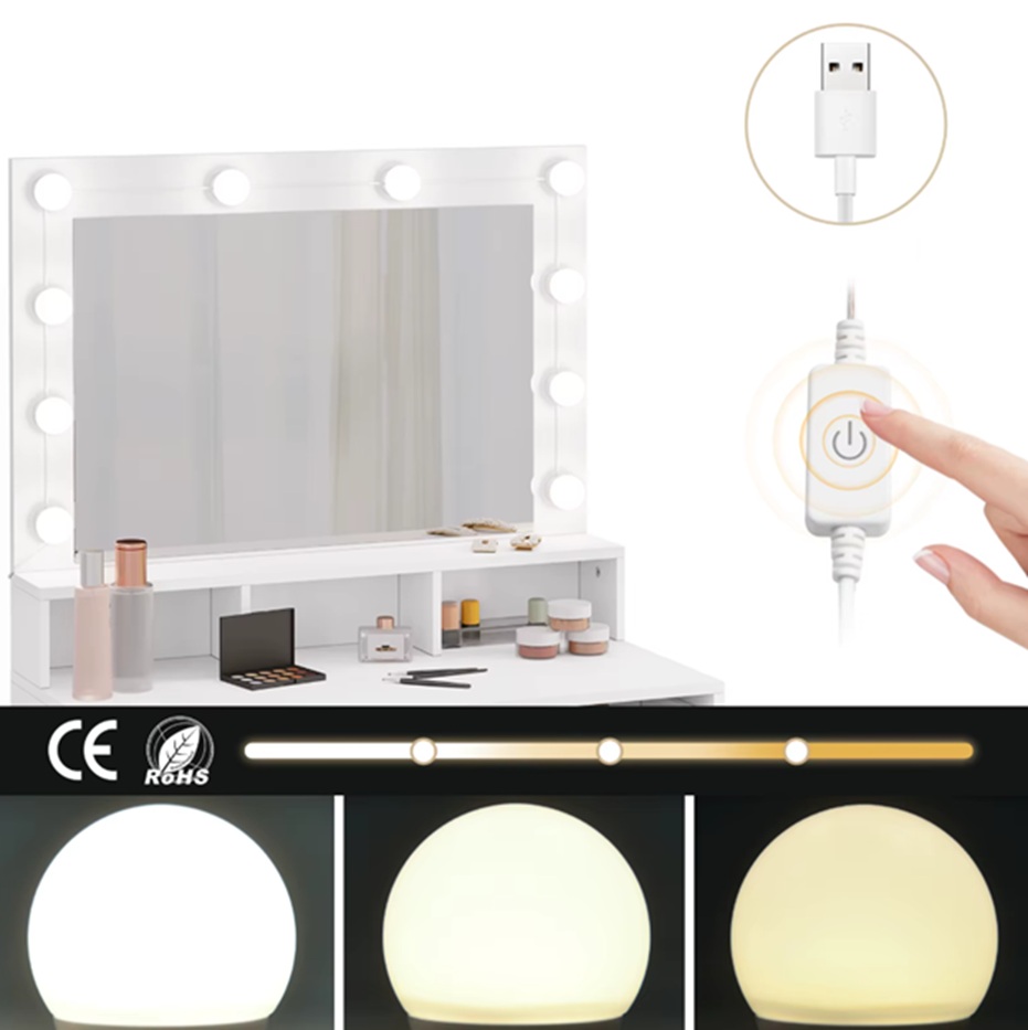 Туалетний столик має стільки, скільки 9 світлодіодних ламп Вони додають шарму та елегантності будь-якій спальні. Кожна жінка відчує себе голлівудською актрисою
