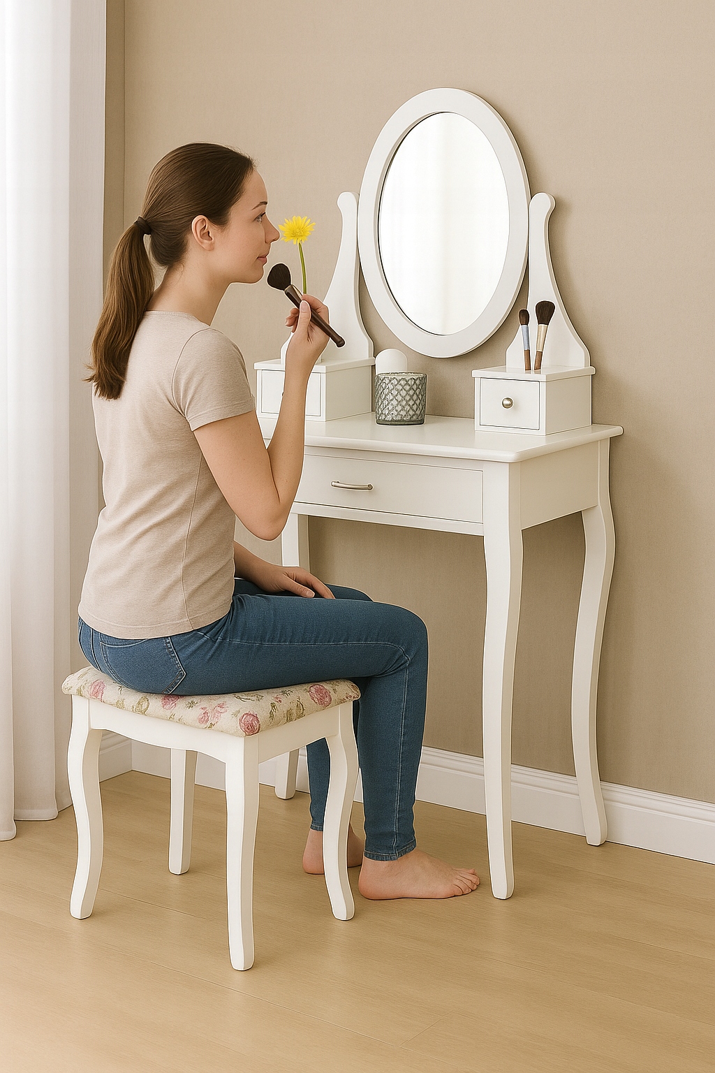 Завдяки компактним розмірам туалетний столик ідеально підходить як для просторих спалень, так і для невеликих кімнат. Зручний табурет із м’яким м’яким сидінням забезпечить комфорт під час повсякденного використання.