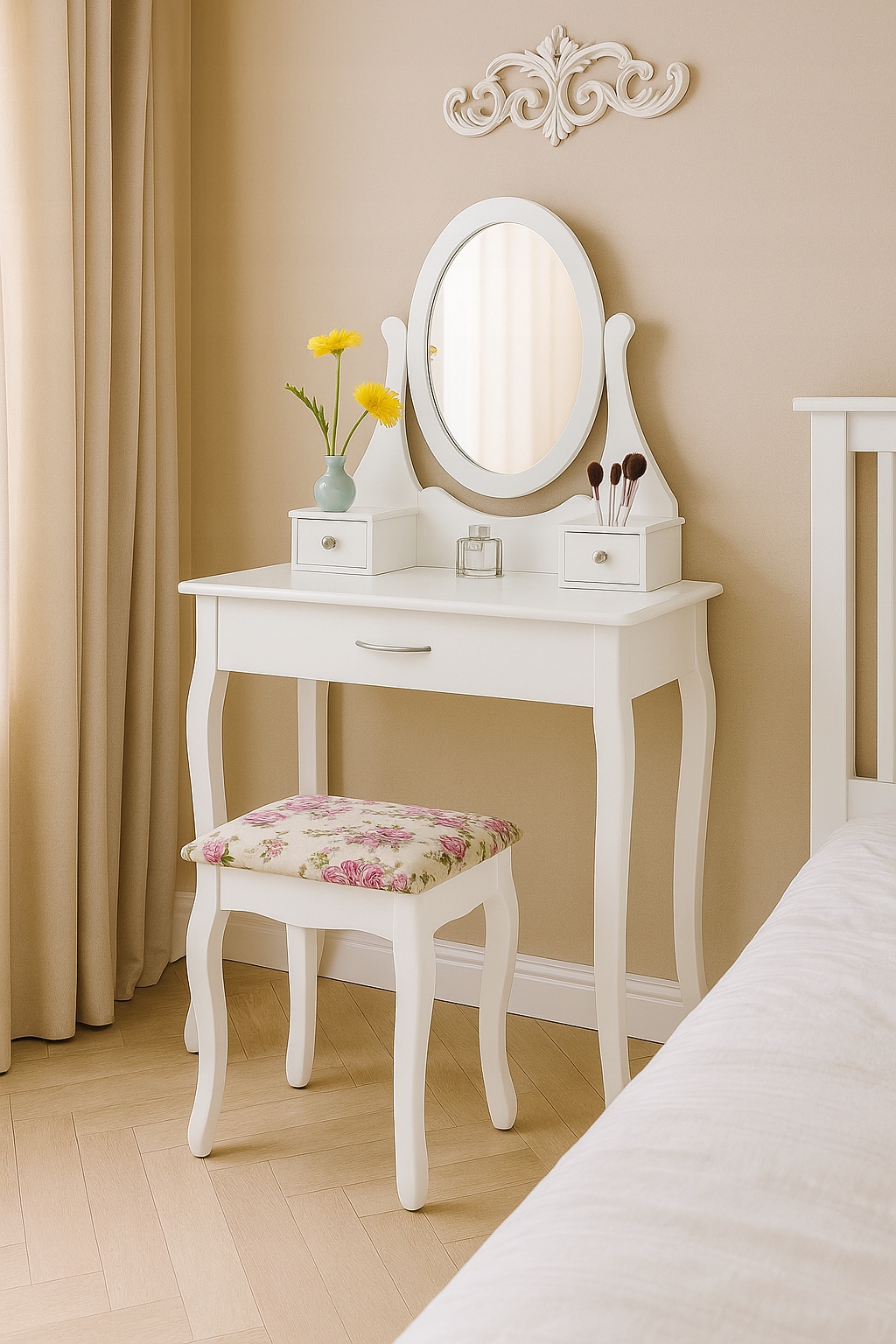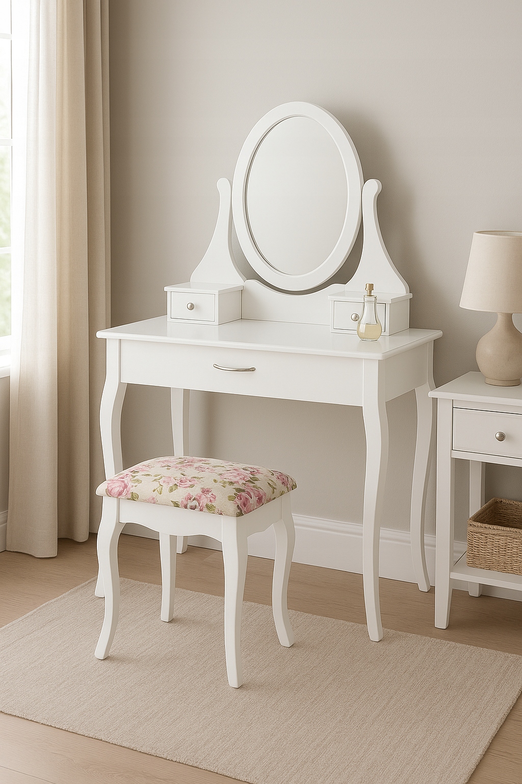 Додайте вашому інтер'єру трохи шарму і функціональності! Цей стильний білий туалетний столик із дзеркалом є ідеальним поєднанням елегантності та практичності. Його ніжні округлі лінії та квітковий візерунок на сидінні надають йому унікальний романтичний характер, який ідеально впишеться як у класичні, так і в сучасні композиції.