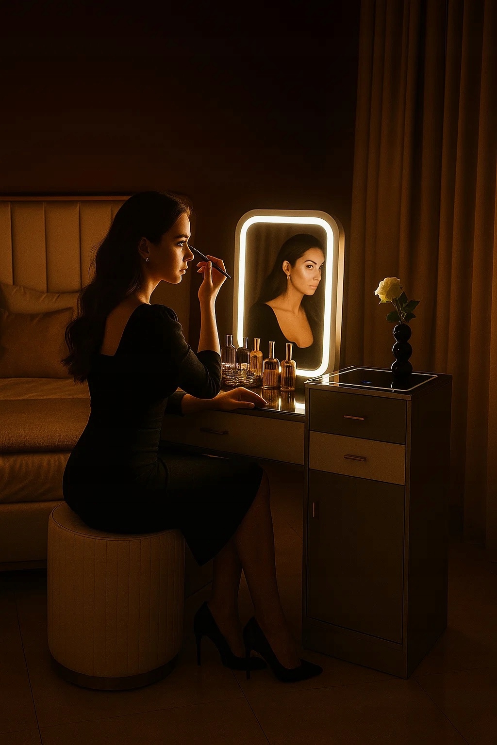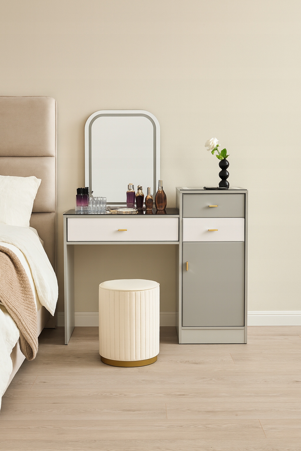 - Пориньте у світ туалетного столика - стильного туалетного столика зі світлодіодним дзеркалом, зручного пуфа та містких ящиків і шафи.