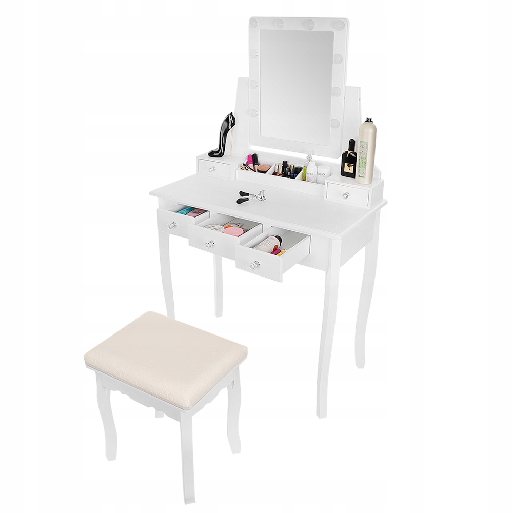 Унікальний косметичний туалетний столик з табуретом і великим дзеркалом.Туалетний столик ручної роботи,табурет виконаний у вікторіанському стилі.Туалетний столик має округлі ніжки та унікальні декорації, зроблені з неймовірною точністю.П'ять висувних ящиків вміщають велика кількість художнього приладдя. косметика.