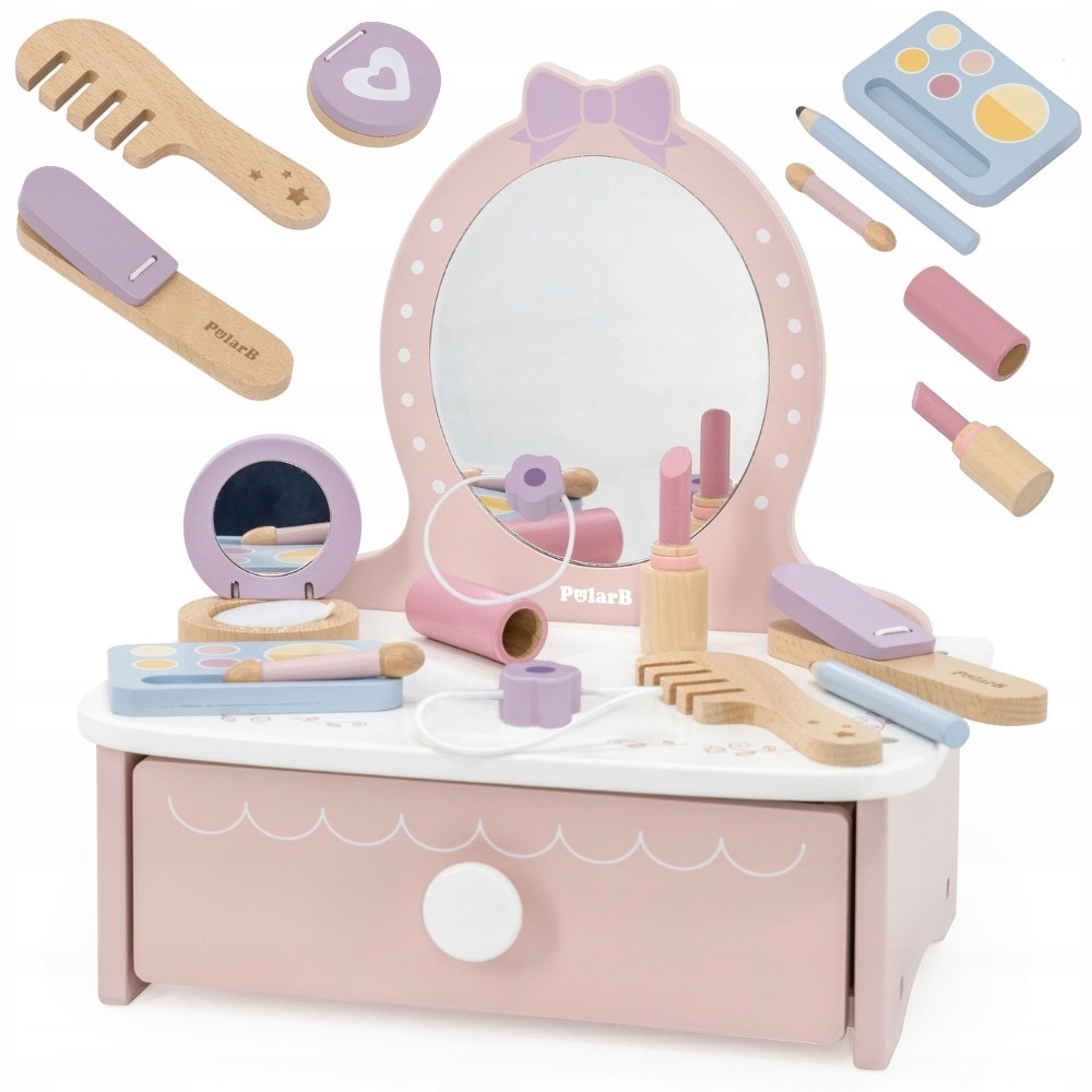 Красивий дерев'яний туалетний столик від бренду Viga — ідеальний ігровий набір для кожної дівчинки, яка любить одягатися, грати в будинок або салон краси. Розроблений у пастельних кольорах, з безпечним дзеркалом і багатьма милими аксесуарами, він подарує вашій дитині багато радості та займе її на довгі години. Цей чарівний дерев'яний туалетний столик - це не просто іграшка - це ворота у світ фантазії та творчих ігор!