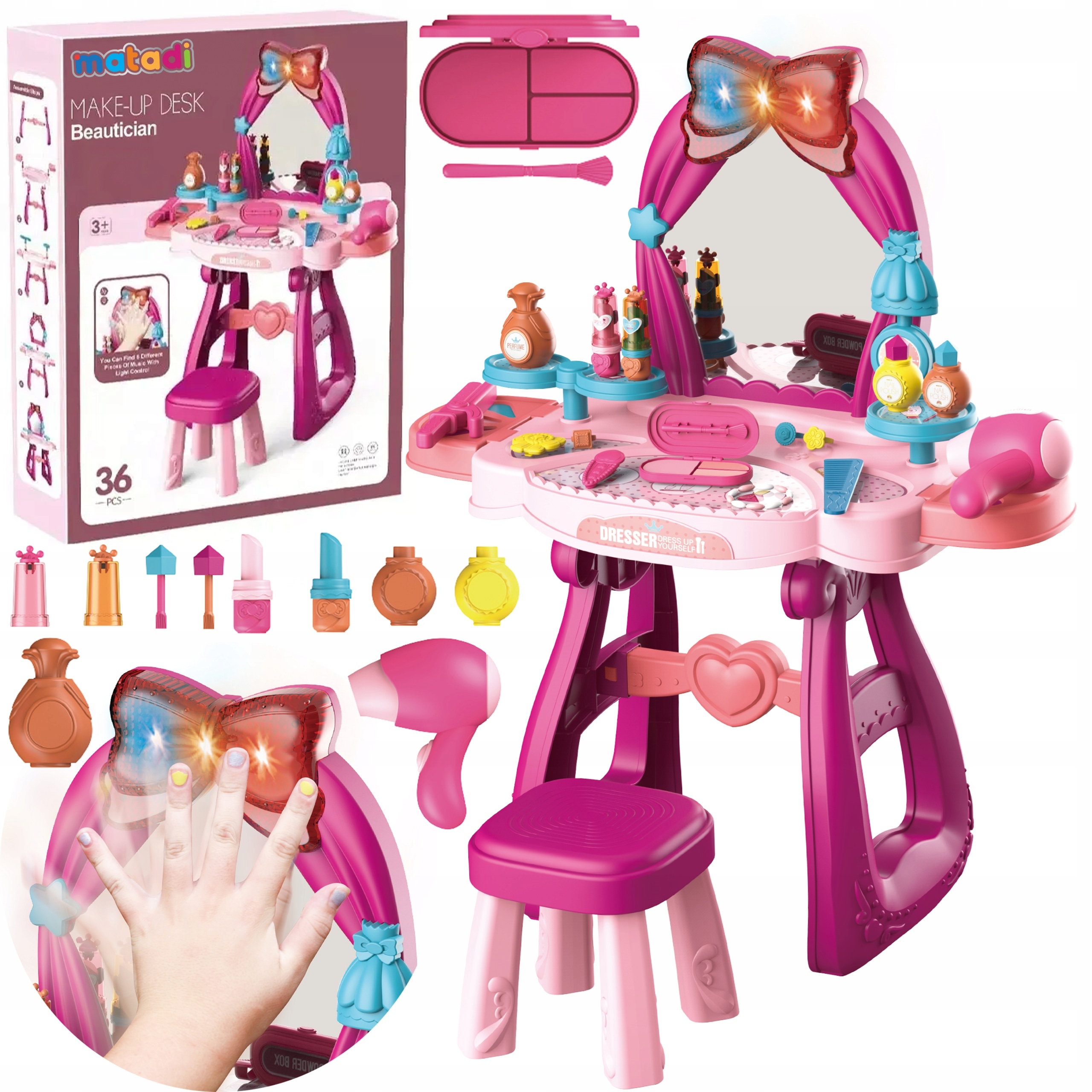 - Туалетний столик оснащений звуковими та світловими ефектами, феном, випрямлячем та багатьма аксесуарами.