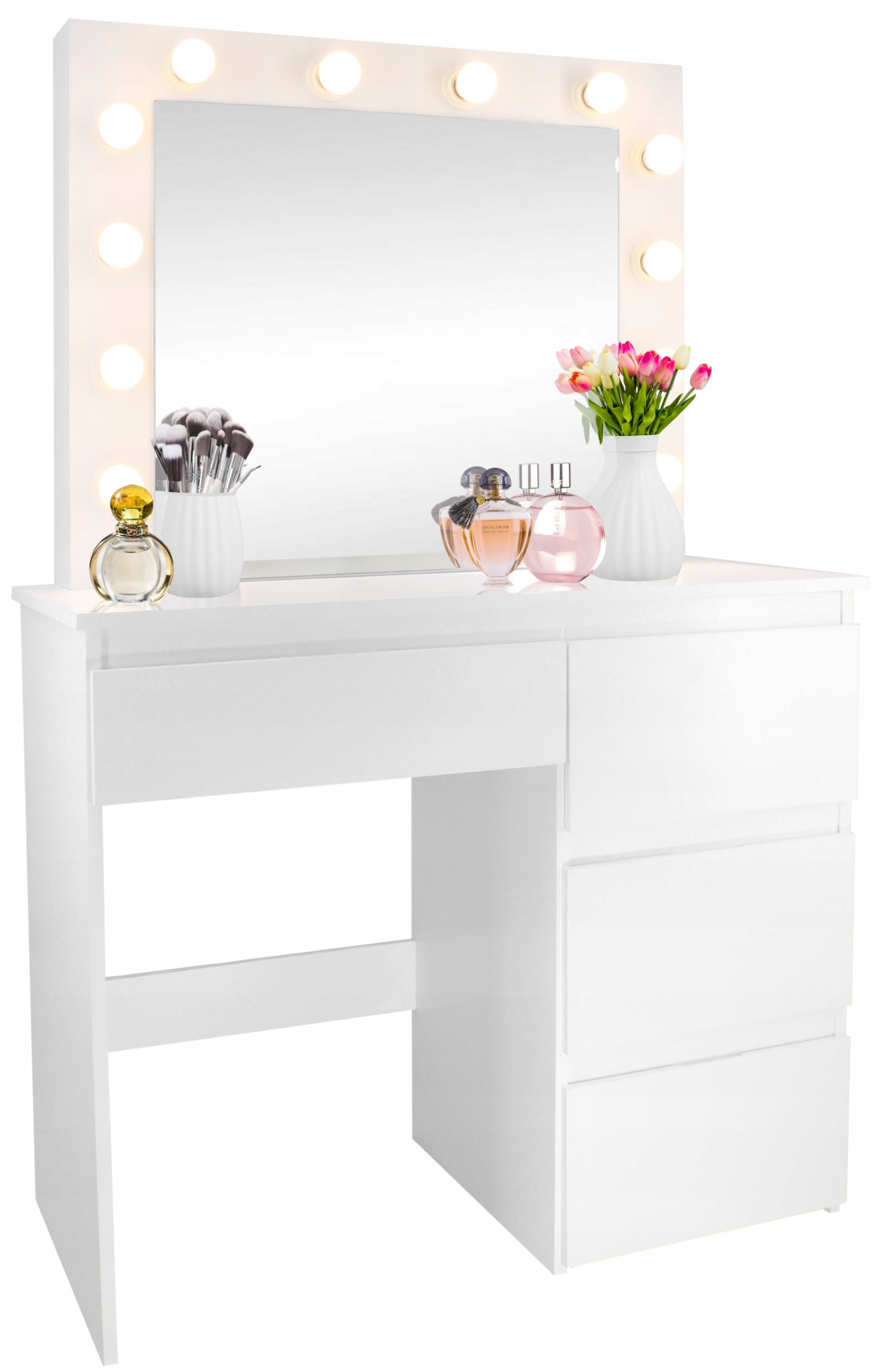 Туалетний столик з підсвічуванням у великому дзеркалі, безперечно, мрія більшості жінок! Це функціональне та практичне рішення. Він дозволяє зберігати улюблену косметику чи прикраси, забезпечуючи комфорт, маючи всі необхідні речі під рукою. Відповідне дзеркало і 12 світлодіодних ламп забезпечують комфорт використання. Кожна жінка відчує себе актрисою ГОЛІВУДУ!