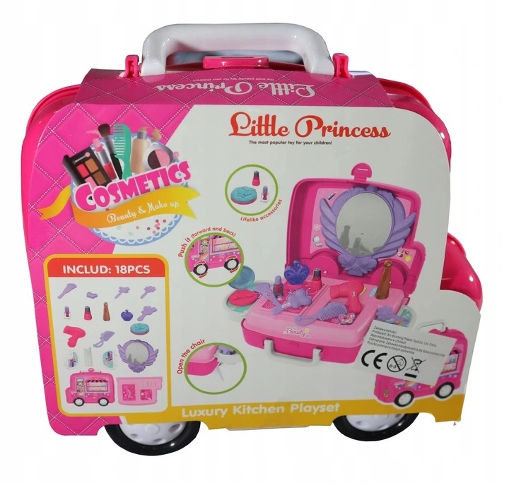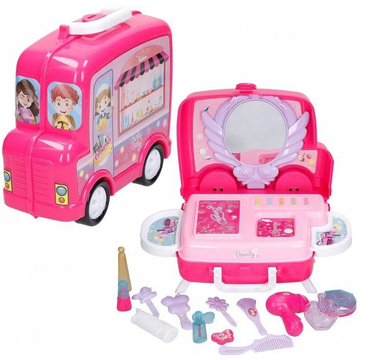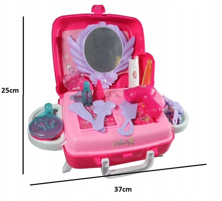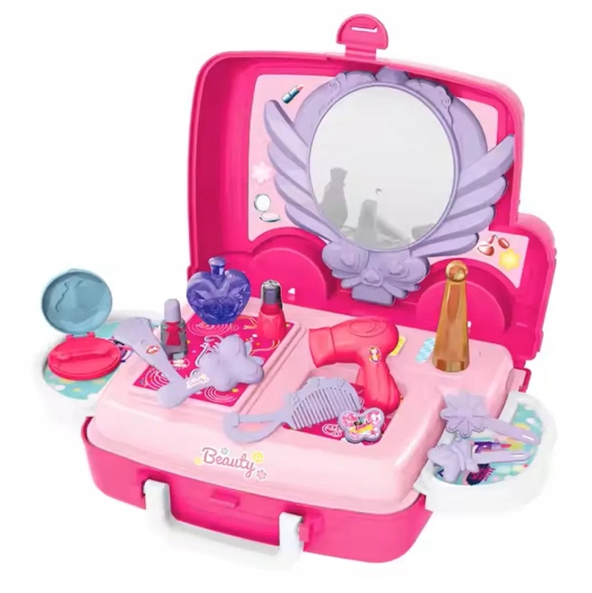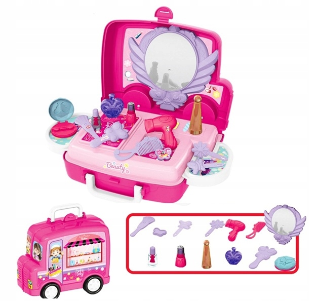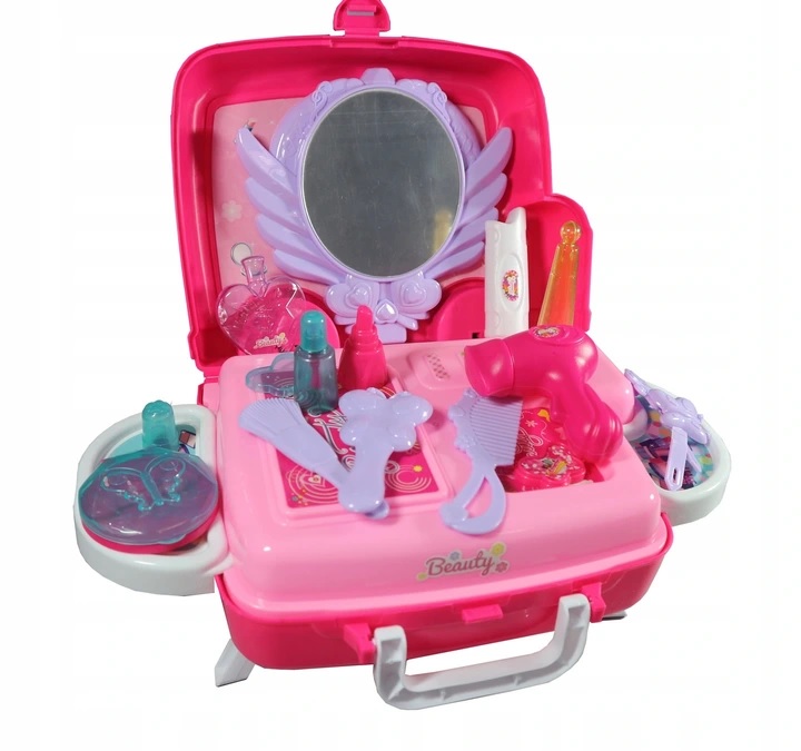 Рожевий туалетний столик на коліщатках, сповнений сюрпризів, подарує кожній дівчині незабутні моменти захопливого веселощів. Відтепер гра в косметолога буде супроводжувати її, куди вона забажає. У цю, здавалося б, маленьку валізу вміщується все необхідне в салоні краси: фен, щітка і гребінець, лак для нігтів, духи, губна помада і компактна пудра. Важко повірити, але весь набір складається з 20 елементів.