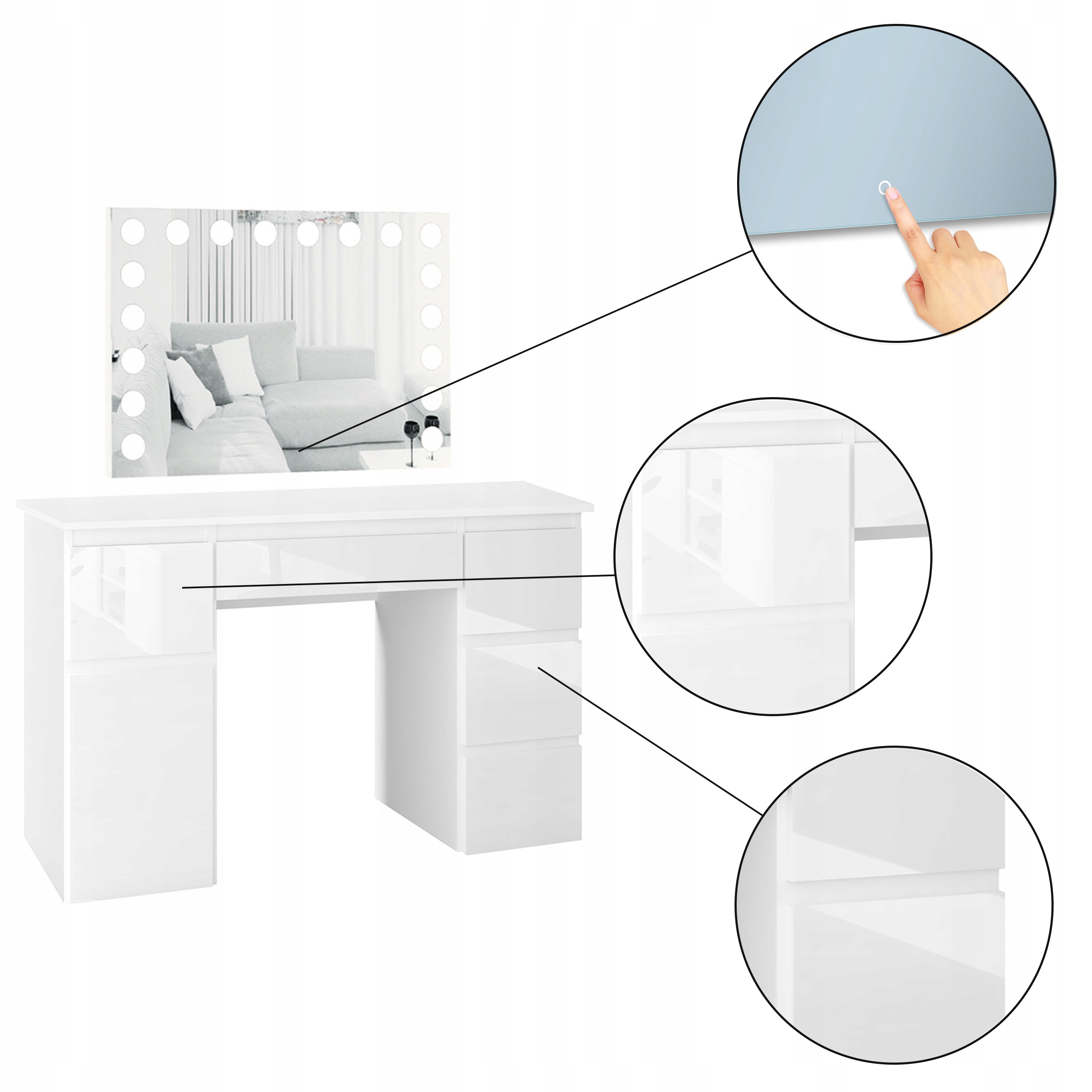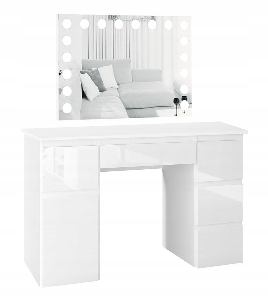Туалетний столик Megan B2 з глянцевими фасадами та світлодіодним дзеркалом є функціональним і необхідним предметом меблів для кожної жінки. Ідеальне місце для макіяжу, а також куточок, де можна подбати про своє волосся. Дзеркало Visage - це сучаснедзеркало, яке завдяки вбудованому підсвічуванню ідеально підсвітить Ваше обличчя. Алюмінієва рама та сенсорний перемикач з функцією регулювання яскравості. елегантності та сучасності додадуть світильники.