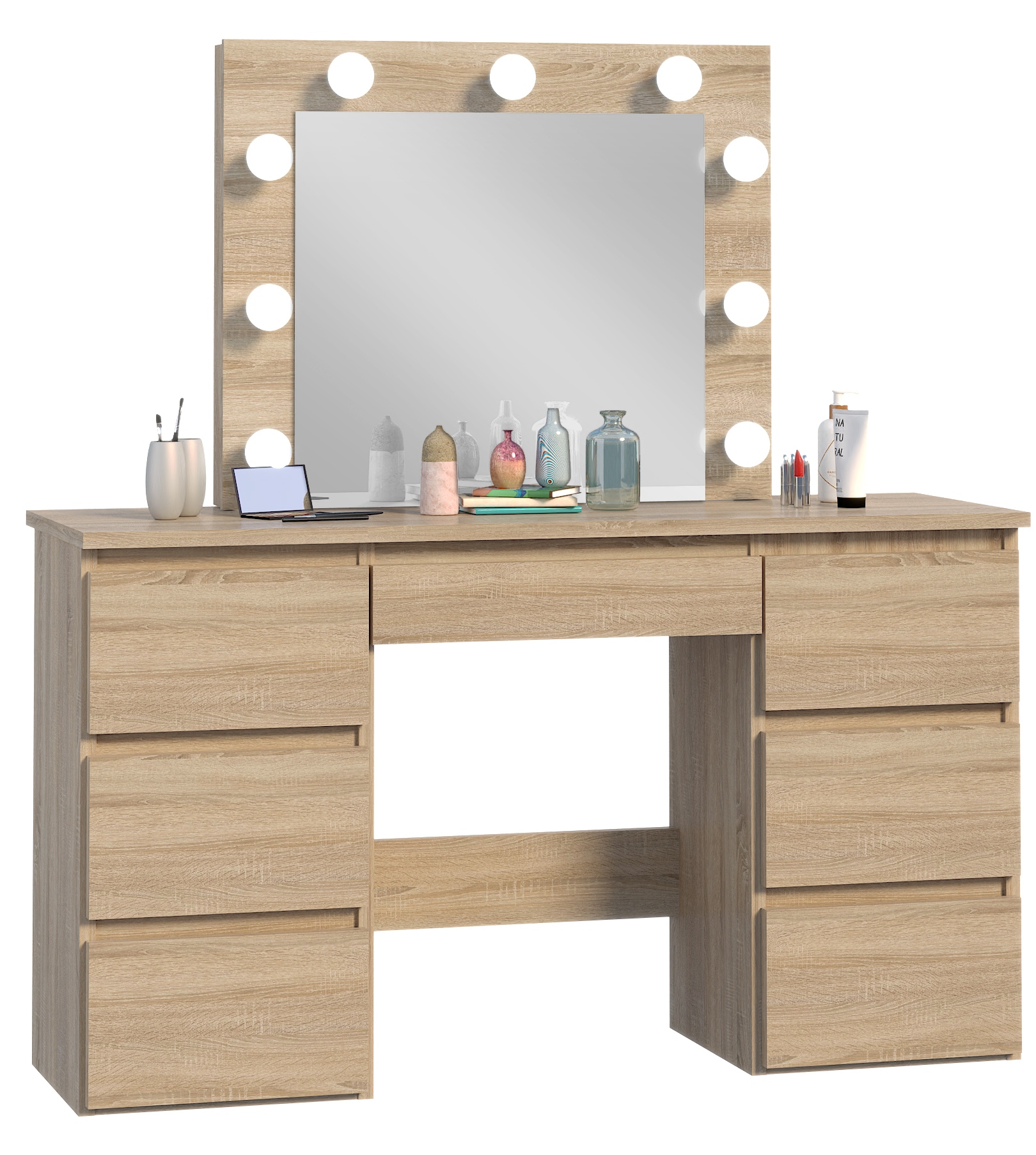 Туалетний столик з дзеркалом, підсвічуваним 9 лампочками, - ідеальне місце для щоденного догляду та підготовки. Оснащений 7 ящиками, він пропонує багато місця для зберігання косметики та аксесуарів. Завдяки гармонійному поєднанню функціональності та елегантності цей туалетний столик стане центром вашого макіяжу та краси.