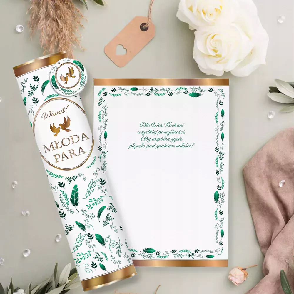 Весільна трубка, висота 25 см, діаметр 5 см. Позолочені, закриті сталевими золотими кришками. A4 вітальна листівка з пиловою курткою та включеною квитком. Ціле упаковане в поліетиленовий пакет з стрічкою та тегом.