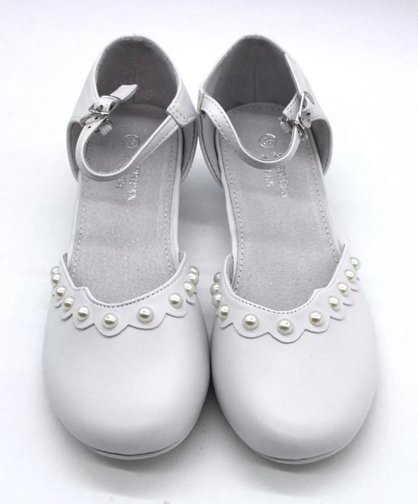 Дівчаче взуттябілого кольору. Балетки Дівчачівиготовлені з комфортної екошкіри, внутрішня вставка з натуральної шкіри. Додаткова застібка на сріблясту пряжку з ремінцем для запобігання спадання взуття з ноги. Красива аплікація з перлами спереду. Біла підошва, низький каблук. Білі балеткиідеально підходять як туфлі для причастя, так і пізніше як туфлі для дівчат.