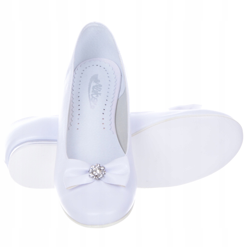 Елегантні, зручні та надзвичайно красиві човники/балетки. Верх виготовлений з м'якої екологічної шкіри, яка забезпечує стопі комфорт при ходьбі. Взуття також має шкіряну профільовану устілку. Легкі, дуже зручні! Зроблено з увагою до деталей. Туфлі на білому невисокому каблуці зі сріблястою вставкою. Прикрашена елегантними білими бантами зі сріблястим декором. Вони ідеально підходять для урочистих випадків. Виріб повністю виготовлено в Польщі компанією MIKO.Ідеально підходить для першого Святого Причастя.