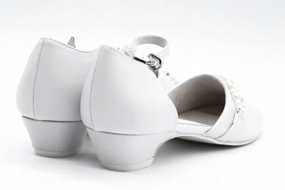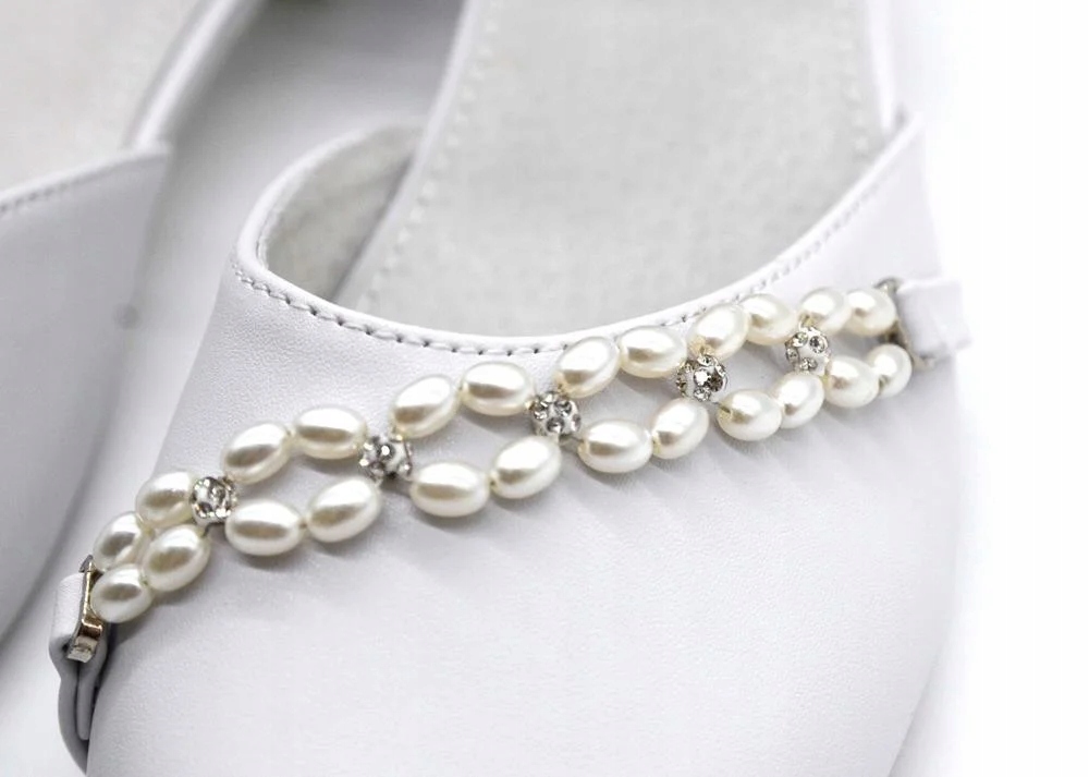 Дівчаче взуттябілого кольору. Балетки Дівчачівиготовлені з комфортної екошкіри, внутрішня вставка з натуральної шкіри. Додаткова застібка на сріблясту пряжку з ремінцем для запобігання спадання взуття з ноги. Спереду красива аплікація з перлами та цирконами всередині. Біла підошва, низький каблук. Білі балеткиідеально підійдуть як туфлі для причастя, а потім і як весільні туфлі для дівчат.