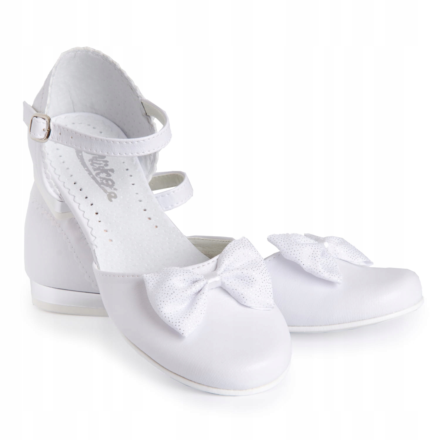 Елегантні білі туфлі для причастя для дівчинки. Дизайн із застібкою та регульованим ремінцем. Взуття має гарну форму, що робить його дуже зручним. Модель на ніжному каблуці висотою 2,5 см білого кольору. Білий бантик додає їм шарму. Класична модель, яка пасуватиме до більшості суконь чи альбомів. Зовнішня частина взуття виготовлена з екологічної шкіри, а каблук і устілка - з натуральної шкіри.