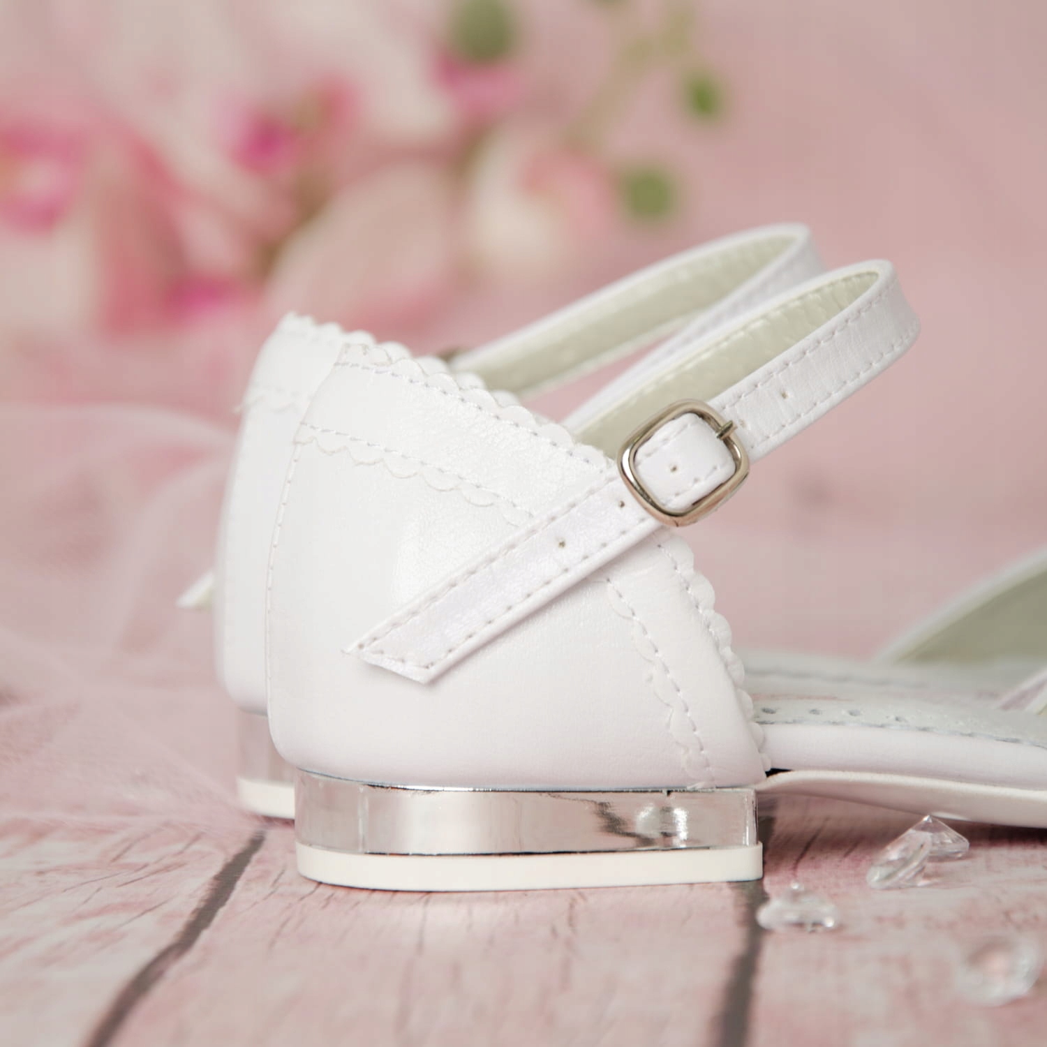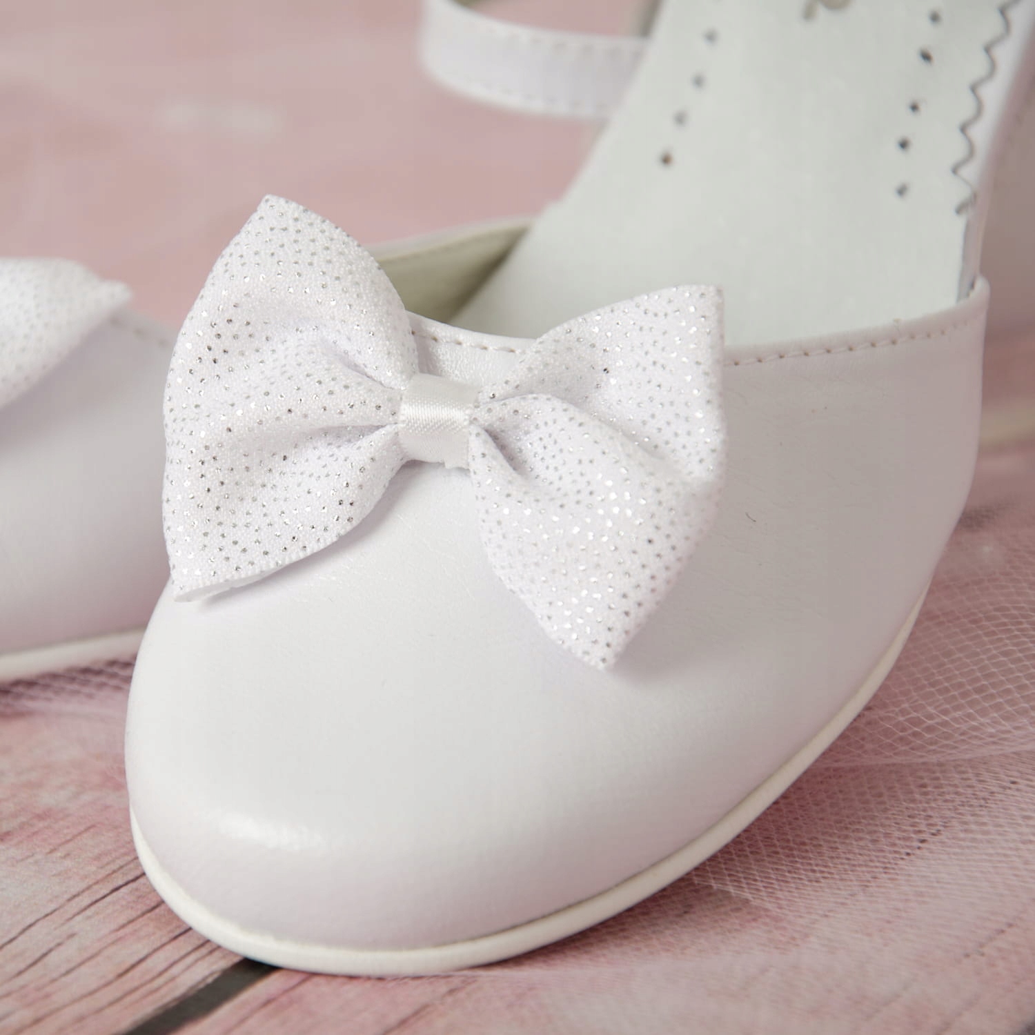 Елегантні білі туфлі для причастя для дівчинки. Дизайн із застібкою та регульованим ремінцем. Взуття має гарну форму, що робить його дуже зручним. Модель на ніжному каблуці висотою 2,5 см білого кольору. Білий бантик додає їм шарму. Класична модель, яка пасуватиме до більшості суконь чи альбомів. Зовнішня частина взуття виконана з екологічної шкіри, а каблук і устілка - з натуральної шкіри.