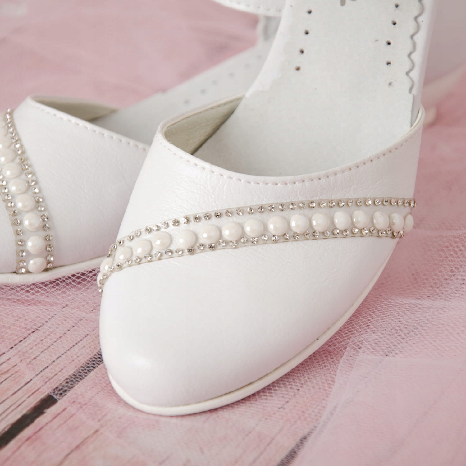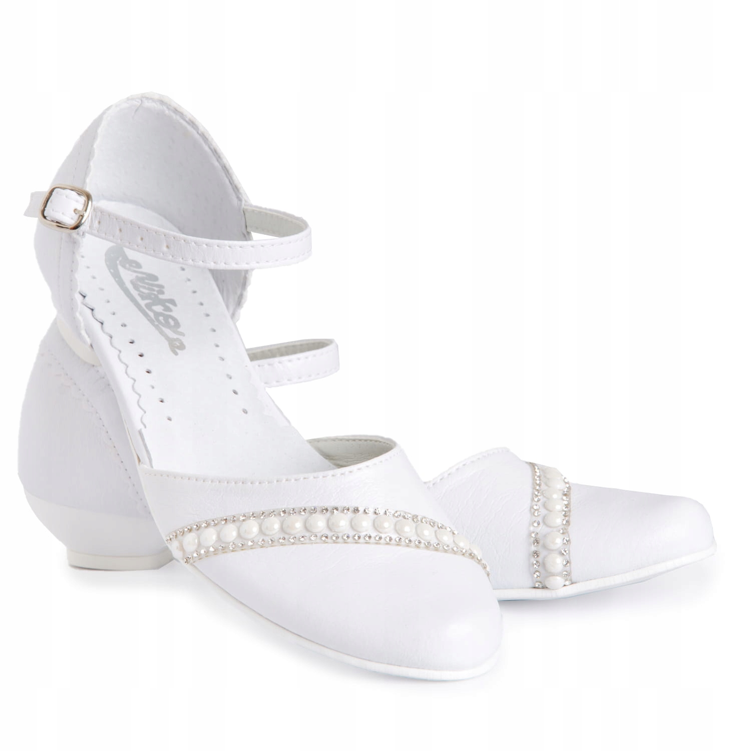 Елегантні білі туфлі для причастя для дівчинки. Дизайн із застібкою та регульованим ремінцем. Взуття має гарну форму, що робить його дуже зручним. Модель на ніжному каблуці висотою 2,5 см білого кольору. Перли додають їм шарму. Класична модель, яка пасуватиме до більшості суконь чи альбомів. Зовнішня частина взуття виконана з екологічної шкіри, а каблук і устілка - з натуральної шкіри.
