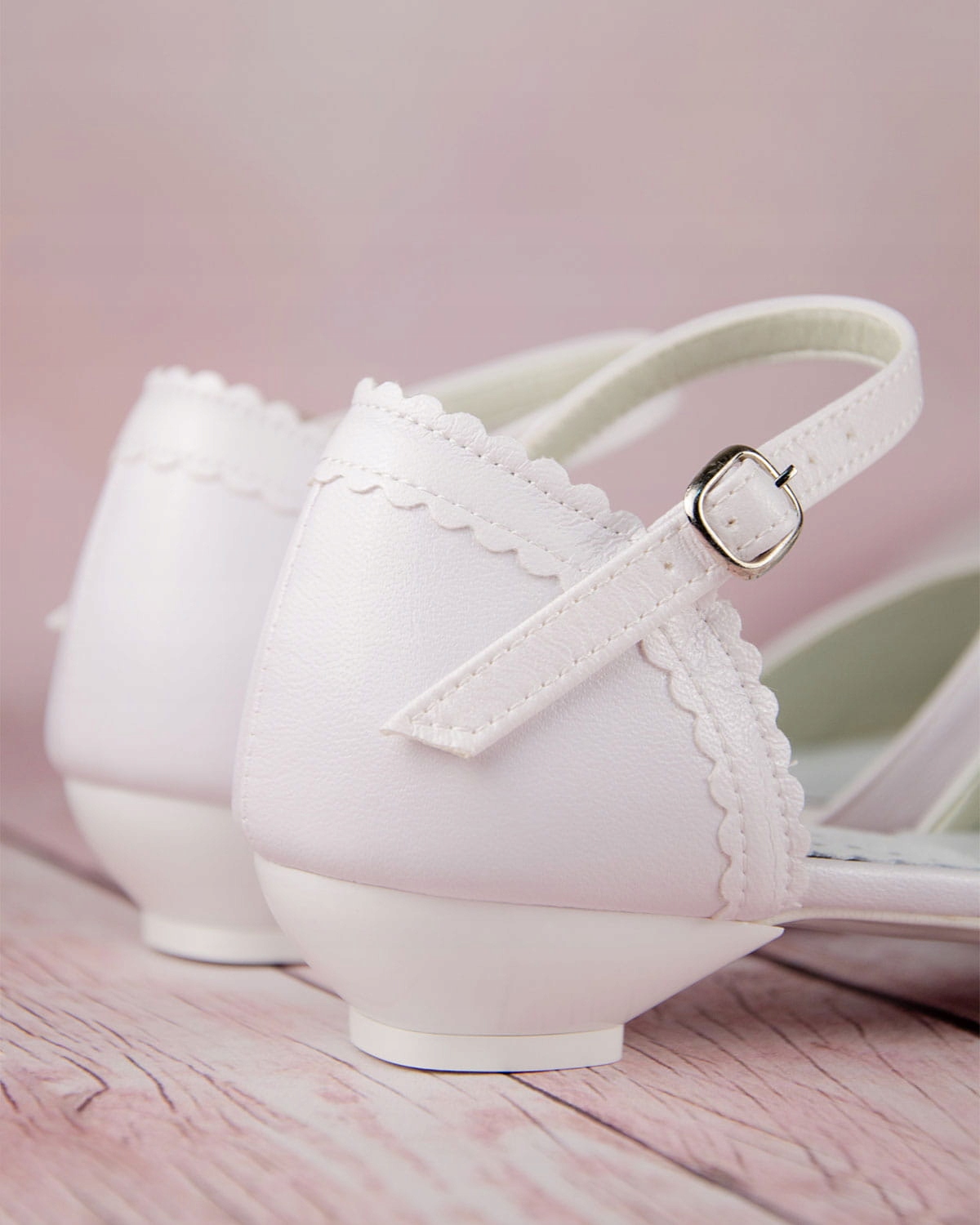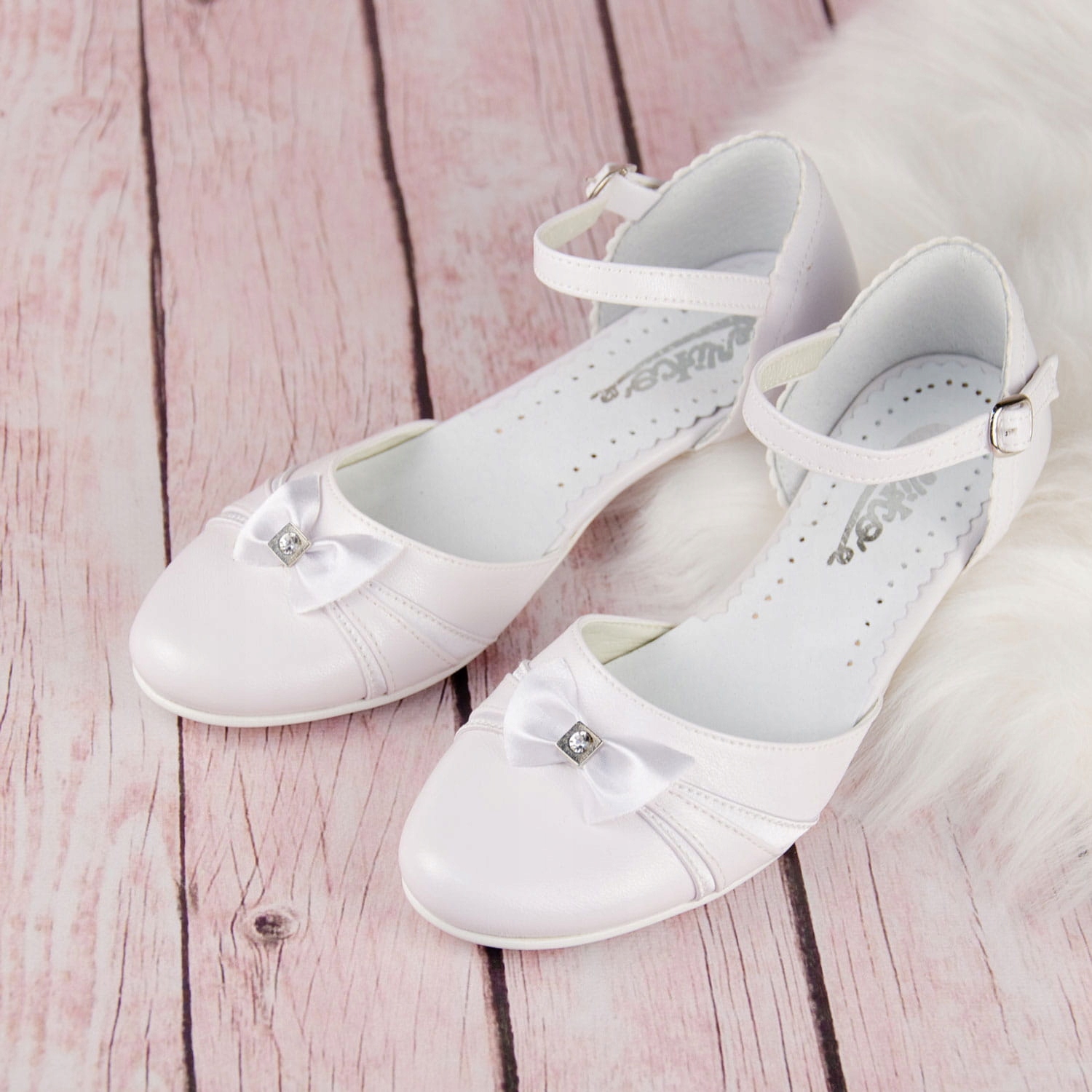 Елегантні білі туфлі для причастя для дівчинки. Дизайн із застібкою та регульованим ремінцем. Взуття має гарну форму, що робить його дуже зручним. Модель на ніжному каблуці висотою 2,5 см білого кольору. Атласний бантик з декором, розміщеним на передній частині взуття, додає шарму. Класична модель, яка пасуватиме до більшості суконь чи альбомів. Зовнішня частина взуття виготовлена з екологічної шкіри, а каблук і устілка - з натуральної шкіри.