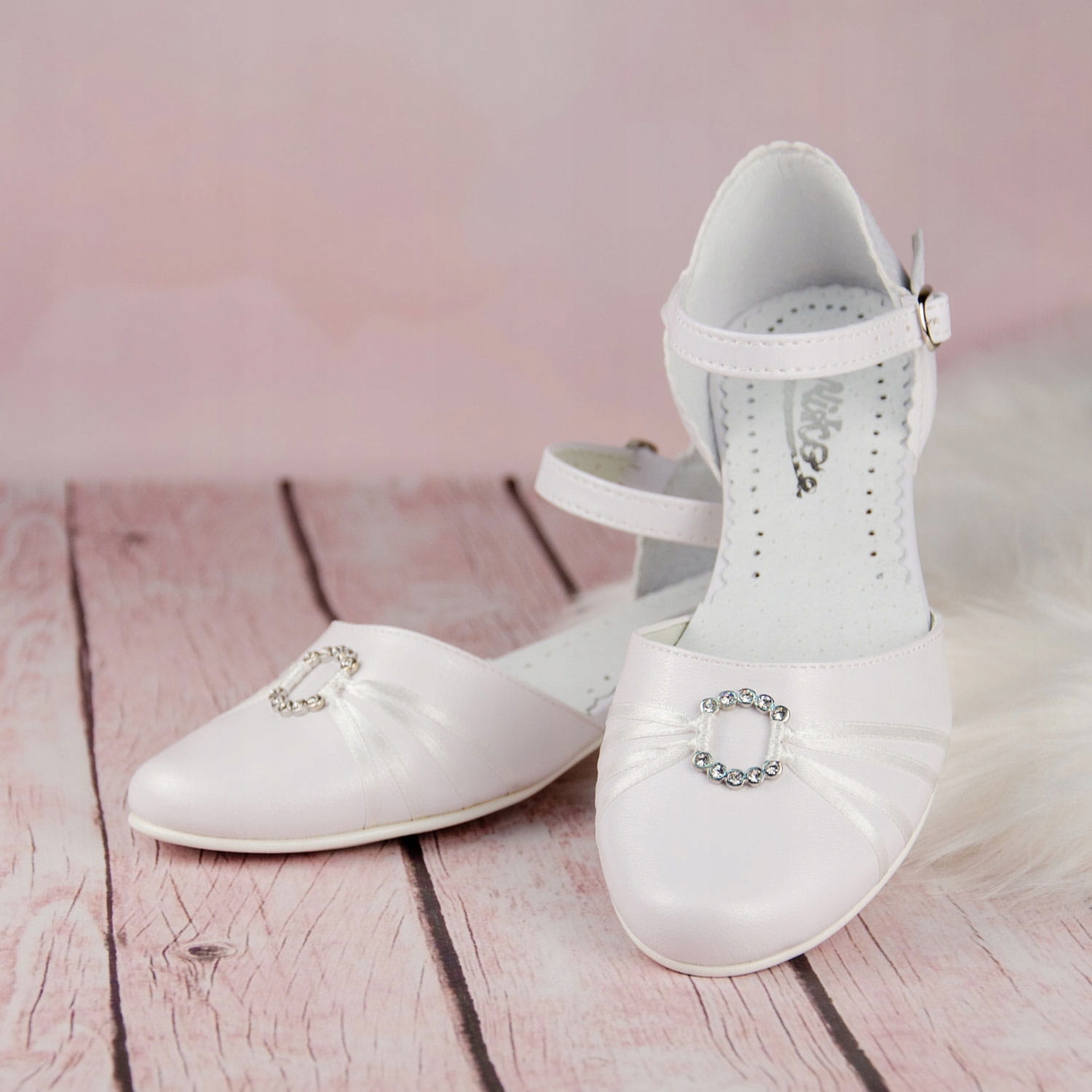 Елегантні білі туфлі для причастя для дівчинки. Дизайн із застібкою та регульованим ремінцем. Взуття має гарну форму, що робить його дуже зручним. Модель на ніжному каблуці висотою 2,5 см білого кольору. Його чарівність підсилює прикраса з цирконами, прикріпленими до тонких стрічок. Класична модель, яка пасуватиме до більшості суконь чи альбомів. Зовнішня частина взуття виконана з екологічної шкіри, а каблук і устілка - з натуральної шкіри.